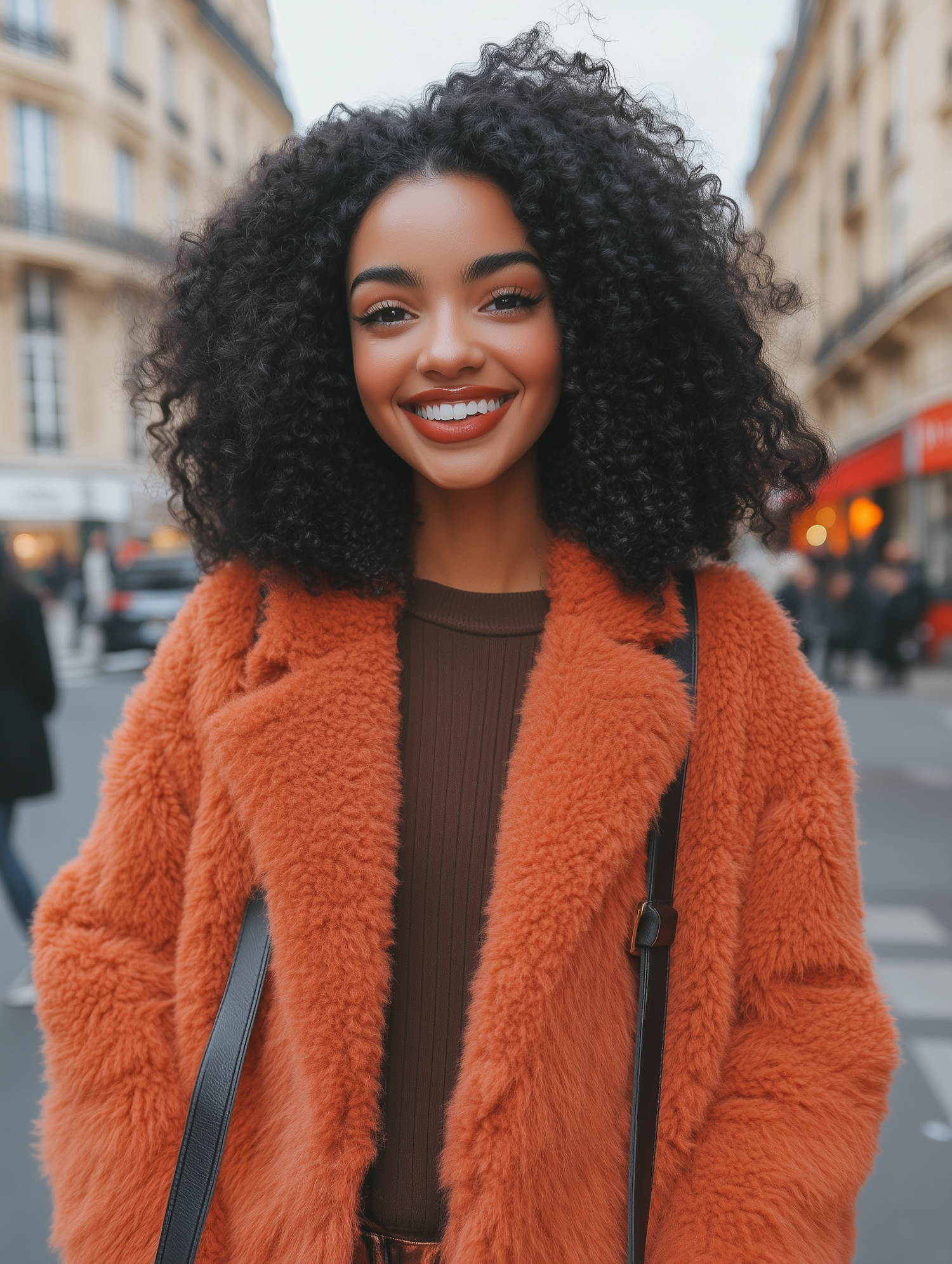 Stylish woman in orange faux fur coat smiles in a bustling city street, showcasing vibrant fashion and joyful expression.