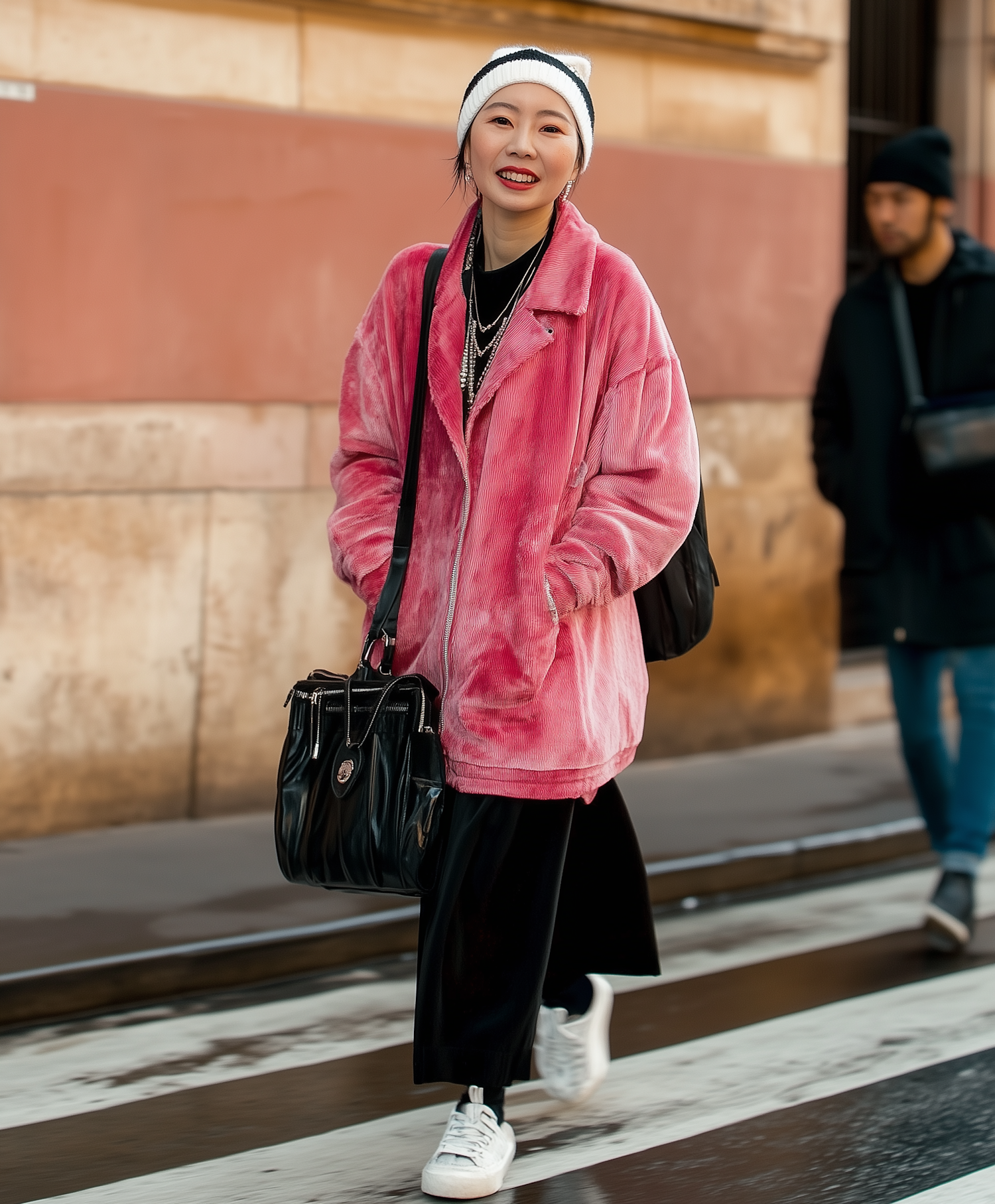 Asian woman in pink faux fur coat and white beanie walking on city street, carrying a black handbag and wearing white sneakers.