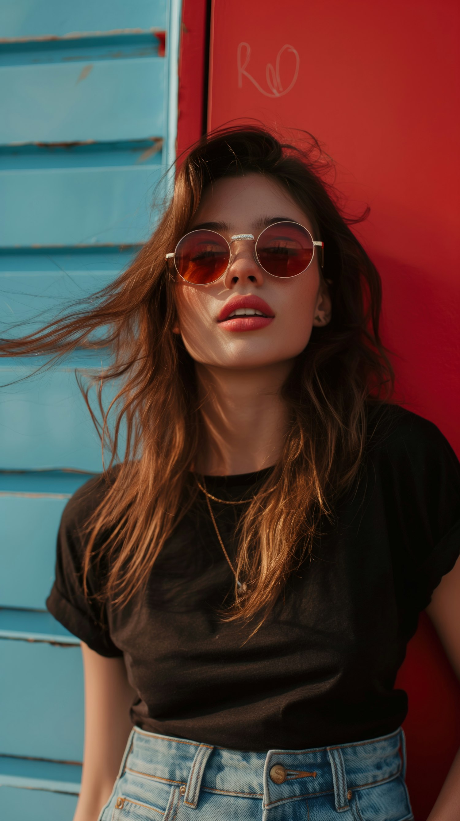 Stylish woman in sunglasses against a vibrant red and blue background, wearing a black t-shirt and denim jeans.