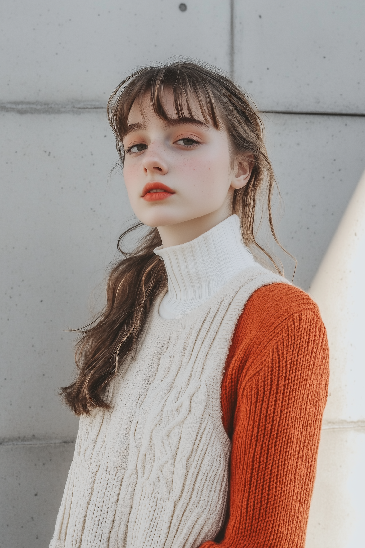 Young woman in layered knitwear against a concrete wall, showcasing autumn fashion with a calm expression and soft lighting.