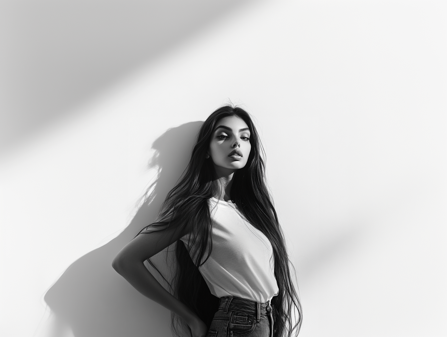 Monochrome portrait of a young woman with long dark hair, wearing a white t-shirt and jeans, against a plain white background.