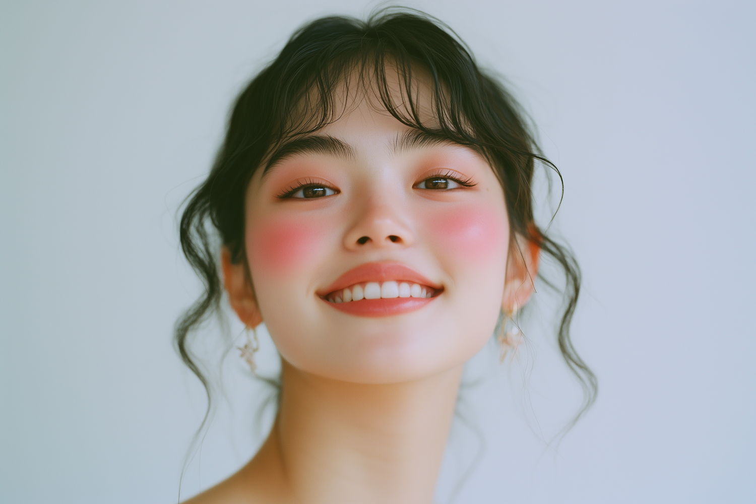 Close-up of a smiling young woman with rosy cheeks, natural makeup, and star-shaped earrings against a soft blue background.