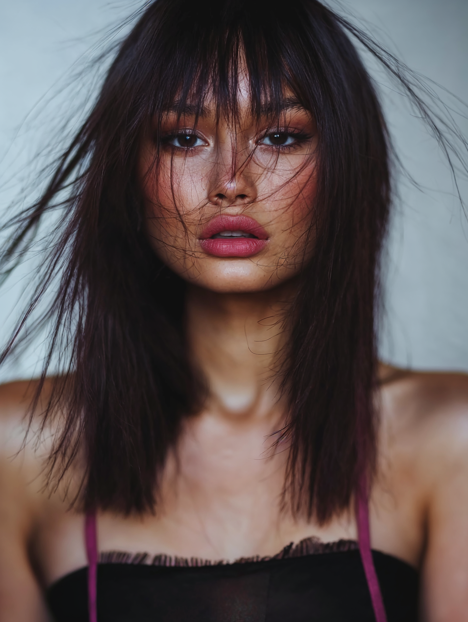 Close-up of a woman with dark brown hair and bangs, wearing subtle makeup and a black top, with a softly blurred background.
