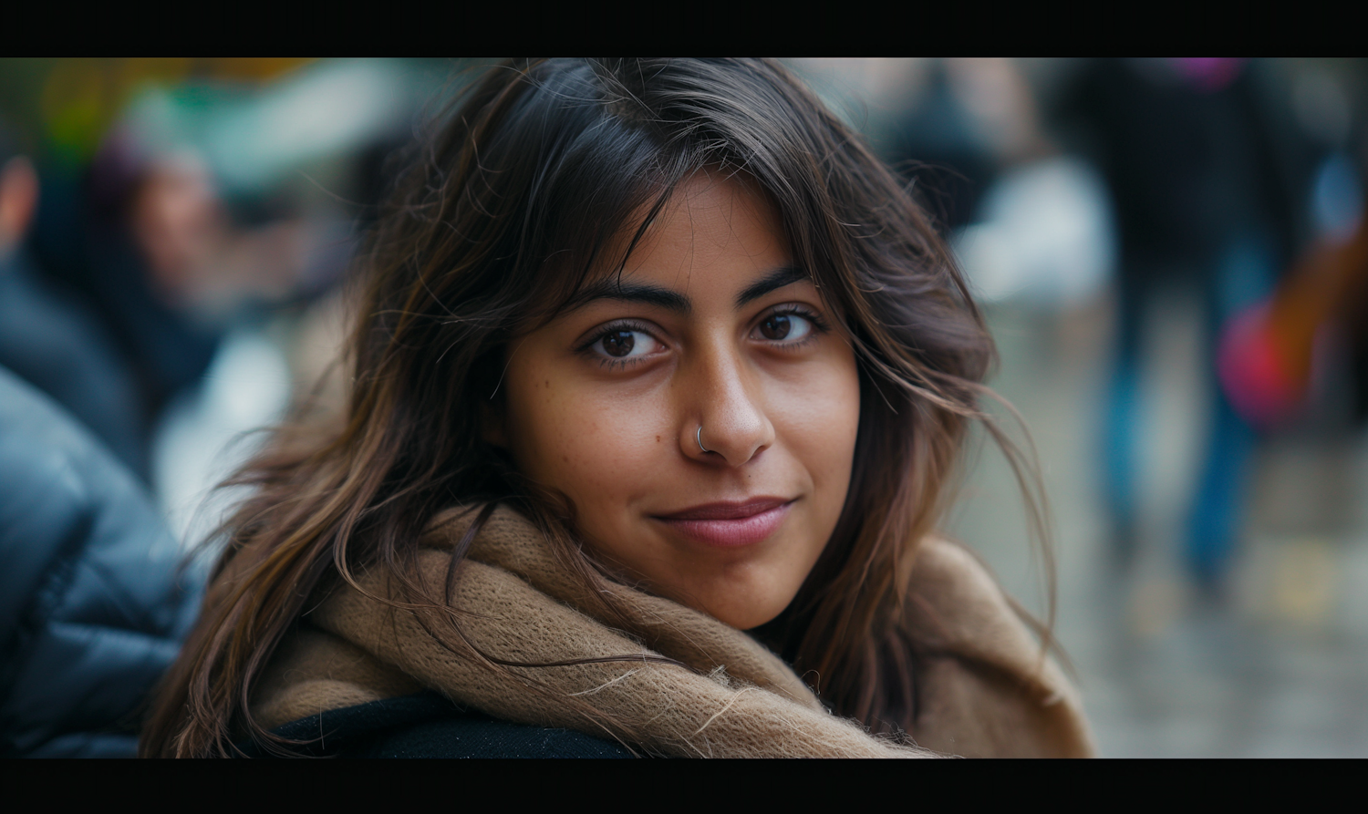 Portrait of a young woman with dark hair and a nose ring, wearing a brown scarf. She smiles gently against a blurred street background.