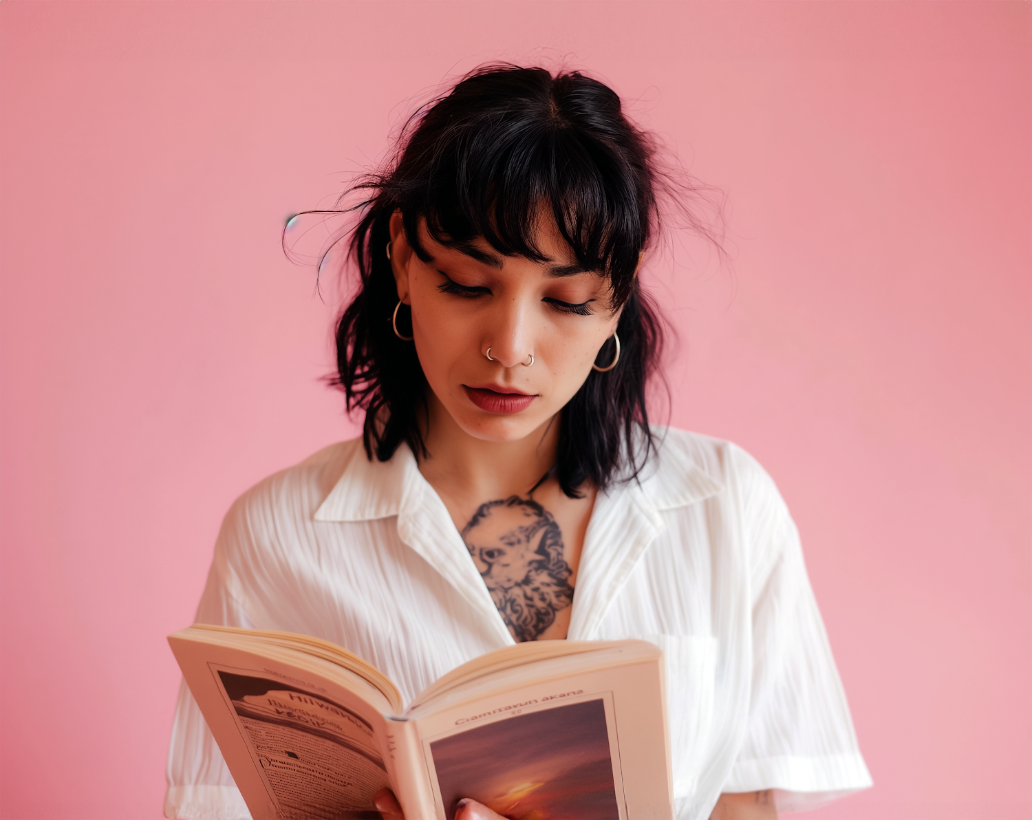 Young woman with black hair and nose ring reading a book against a pink background, wearing a white shirt and showing a chest tattoo.