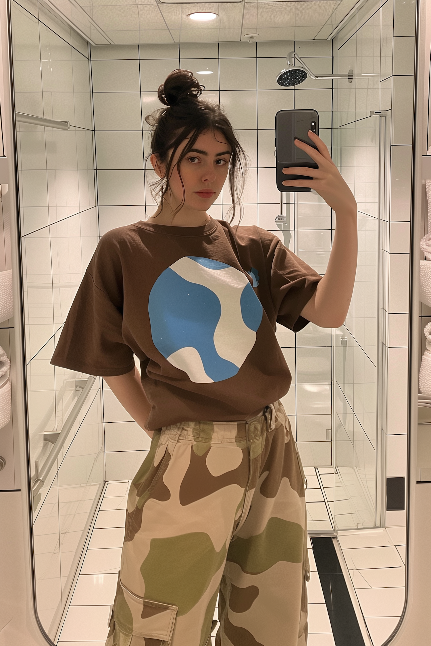 Young woman in a brown planet graphic tee and camo pants takes a mirror selfie in a modern tiled bathroom.