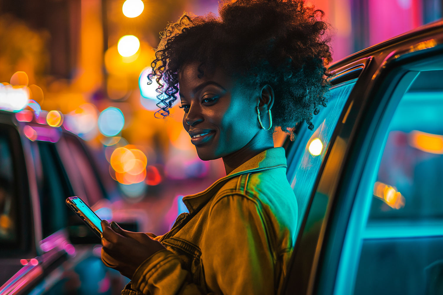 Stylish woman with curly hair and yellow jacket smiles while using her phone in a neon-lit urban night scene.