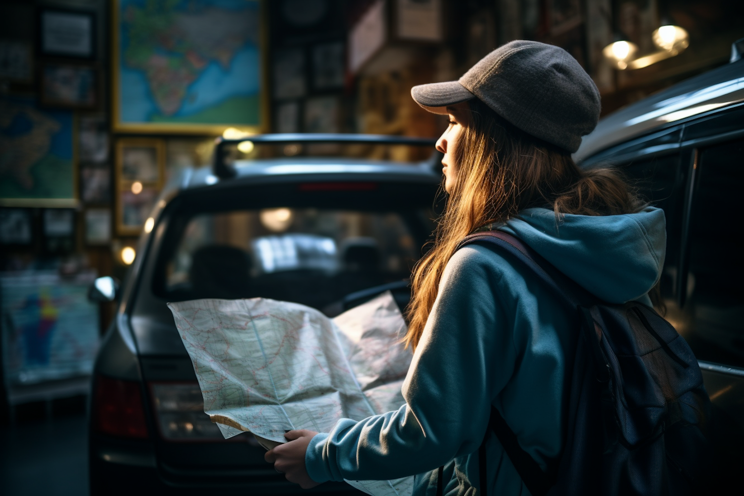 Young woman in a cap and hoodie studies a map in a room filled with framed maps, next to a car, suggesting an adventure.
