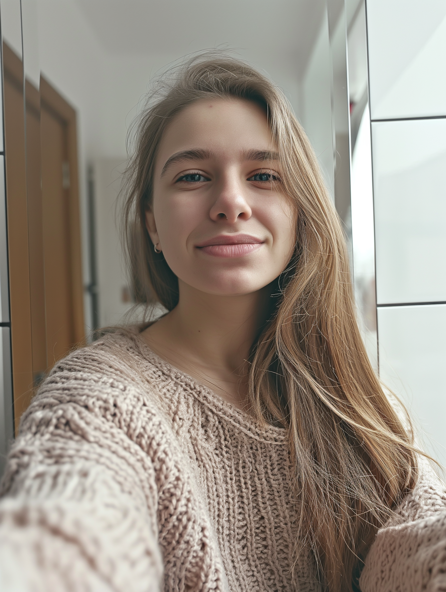 Young woman with light brown hair and a beige knit sweater takes a selfie in a cozy, well-lit indoor setting with tiled walls.