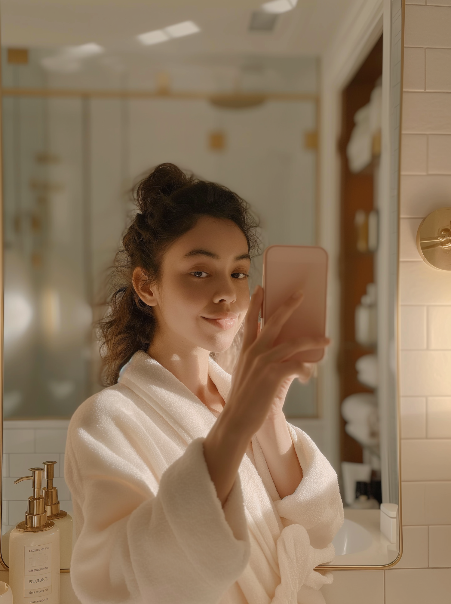 Young woman in a white bathrobe takes a selfie in a warmly lit bathroom, capturing a serene moment of self-care.