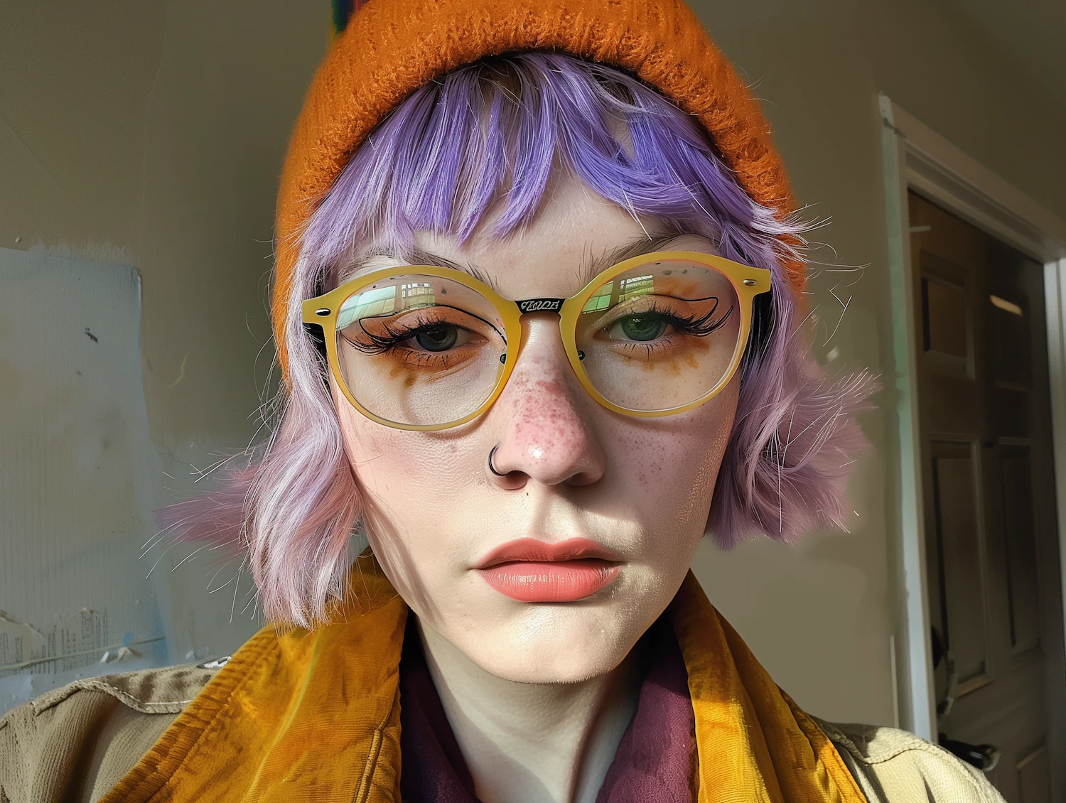 Young woman with lavender hair, orange beanie, and yellow glasses. Bold makeup and mustard jacket create a vibrant, quirky look.