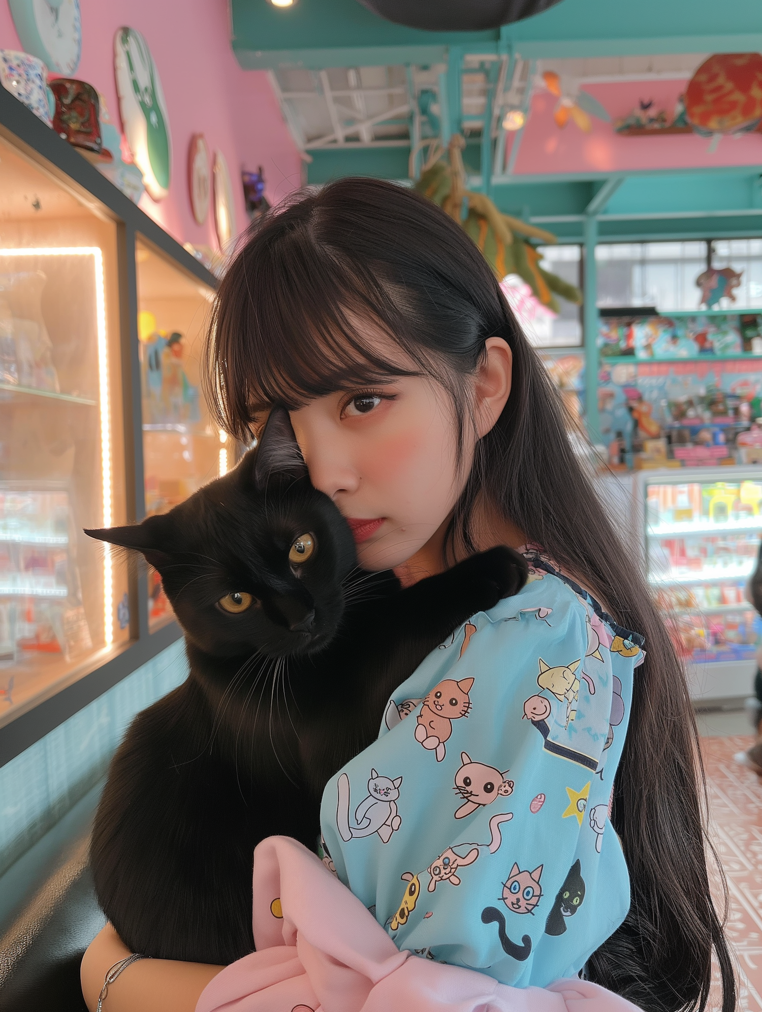 Asian woman with long dark hair holds a black cat in a colorful room with pink and teal decor, wearing a cat-themed top.