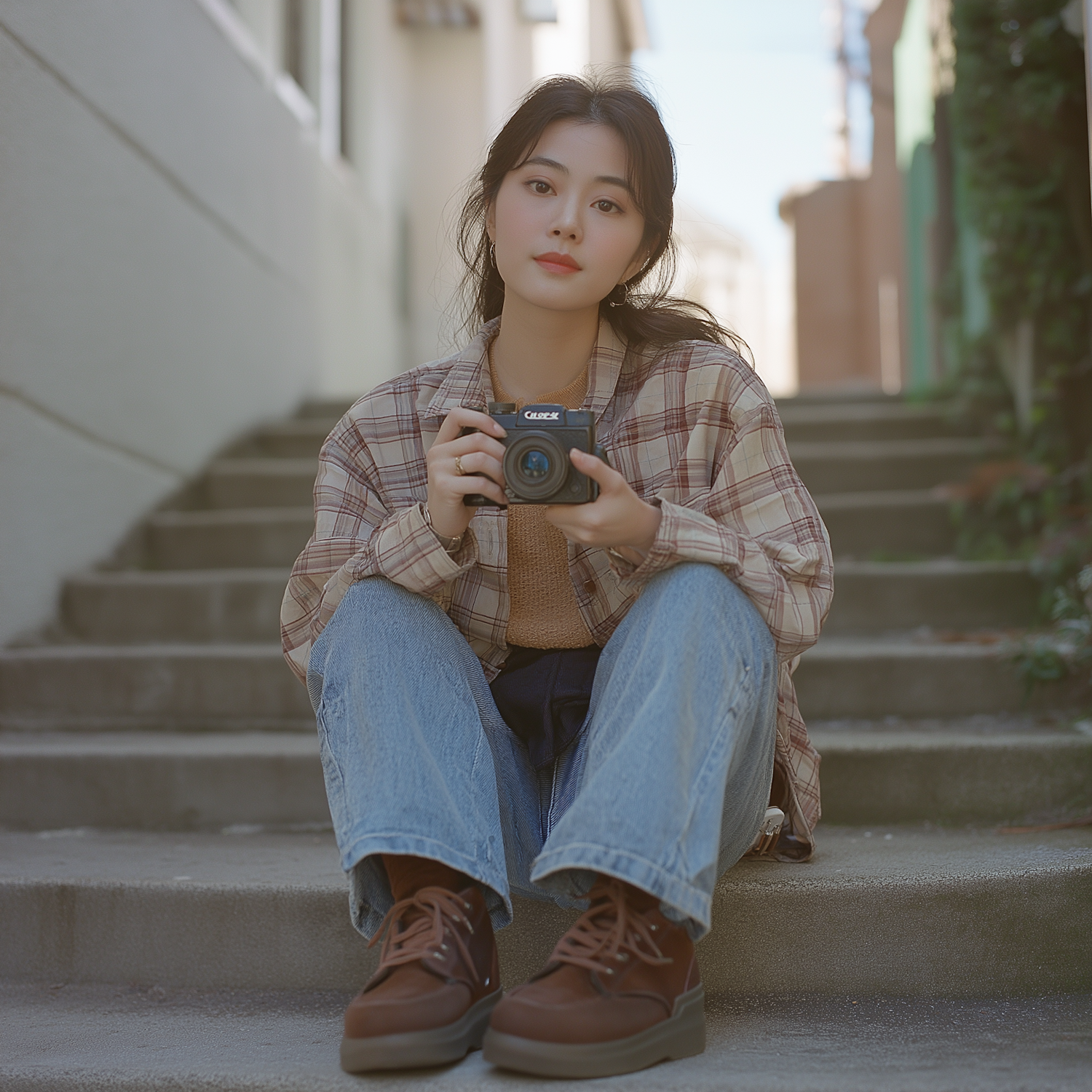 Young woman with a camera sits on steps, wearing plaid shirt and jeans, in an urban setting. Calm expression, casual style.