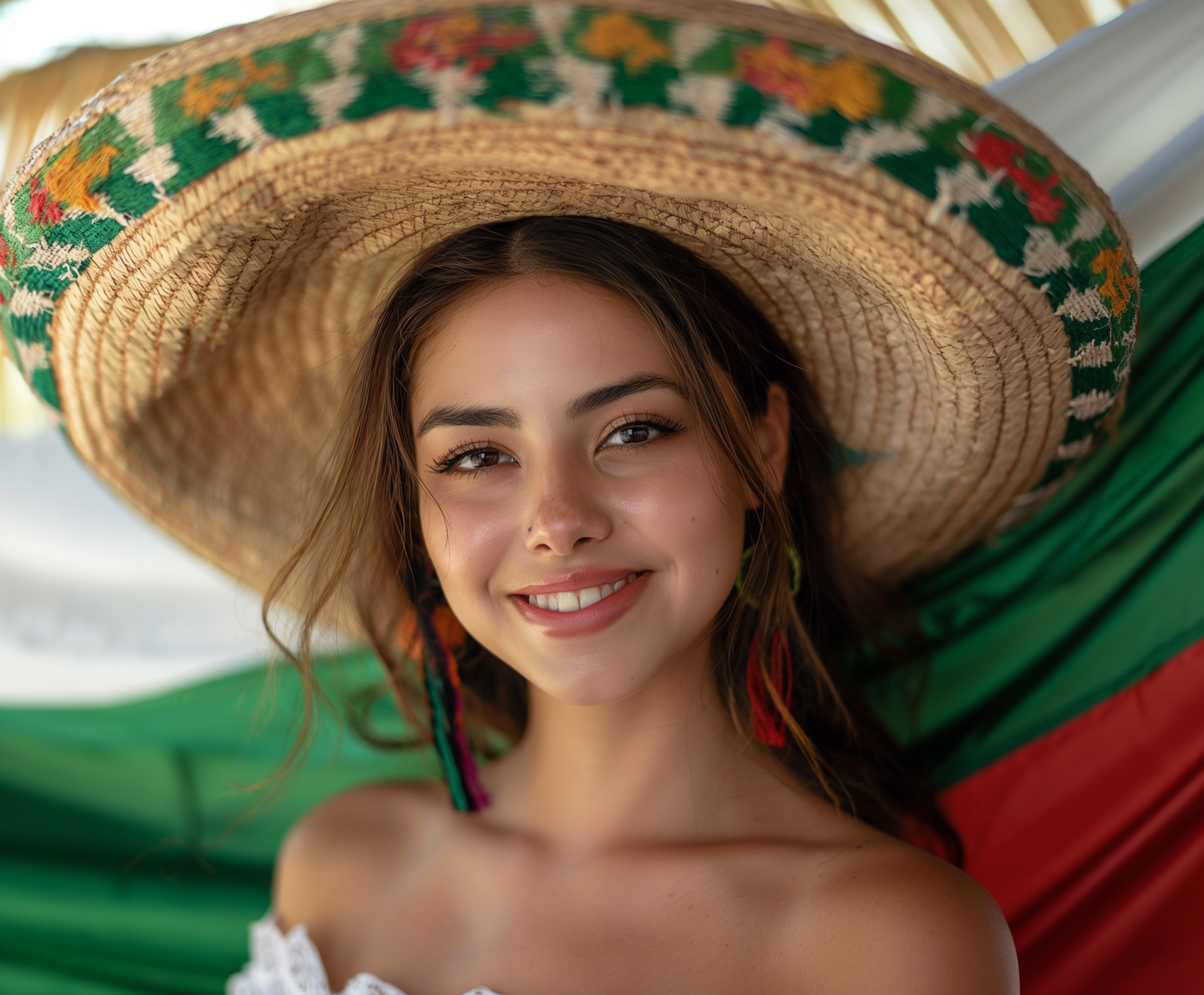 Smiling woman in a colorful sombrero with a Mexican flag background, showcasing vibrant cultural attire and joyful expression.