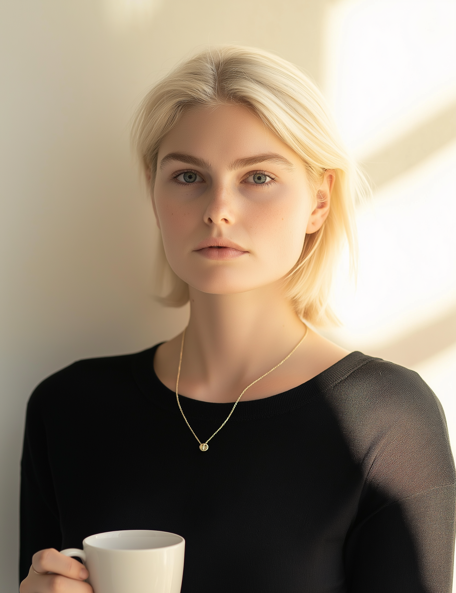 Young woman with blonde hair and blue eyes holding a mug, wearing a black top and gold necklace, in soft natural light.
