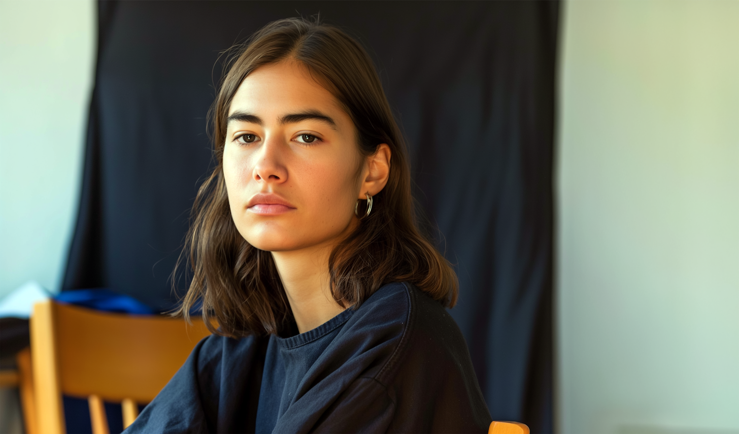 Young woman with brown hair and hoop earrings in a softly lit room, wearing a black top. Neutral expression, wooden chair in the background.