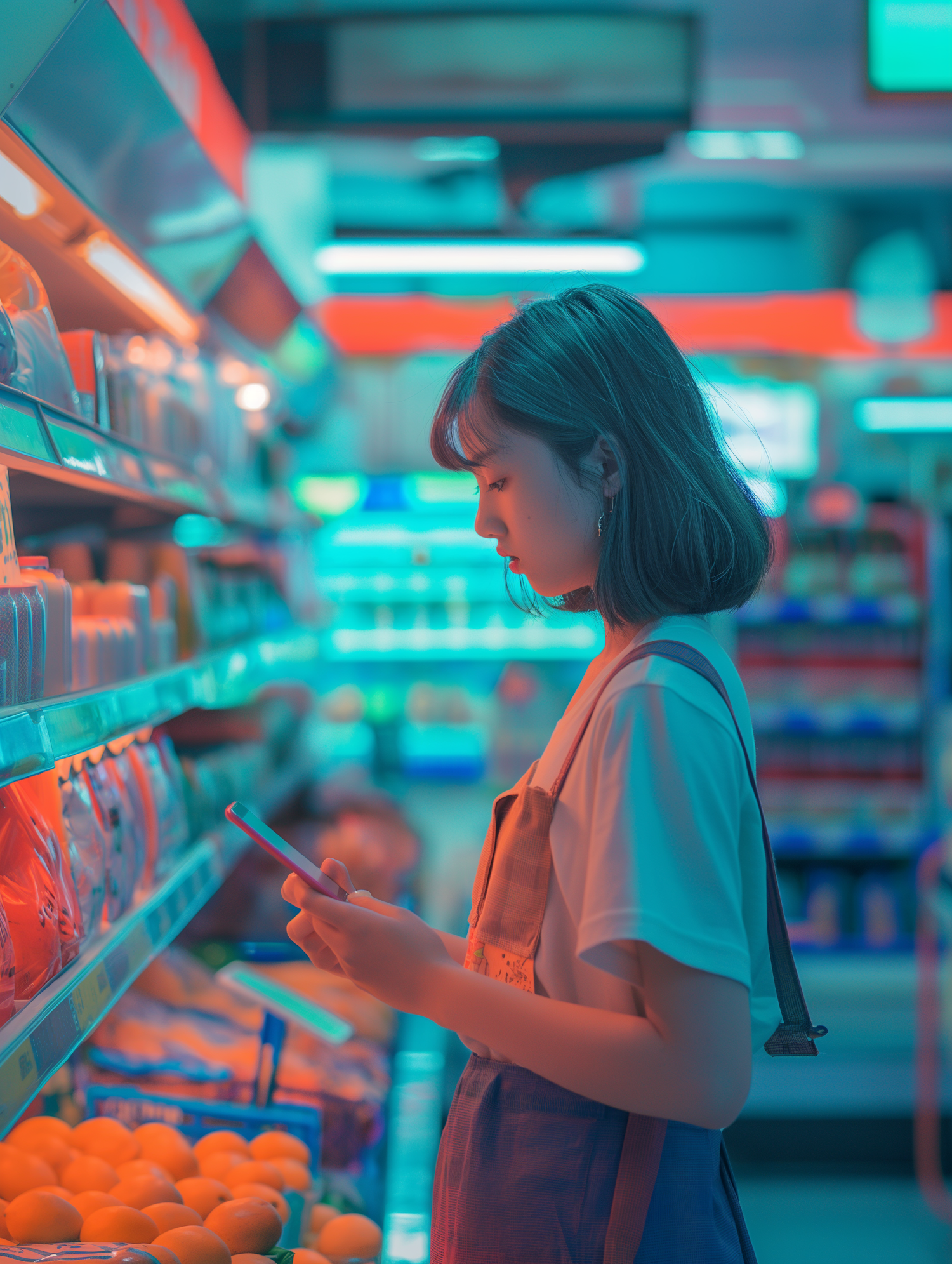 Asian woman in a grocery store aisle, focused on her smartphone, surrounded by vibrant lighting and stocked shelves.