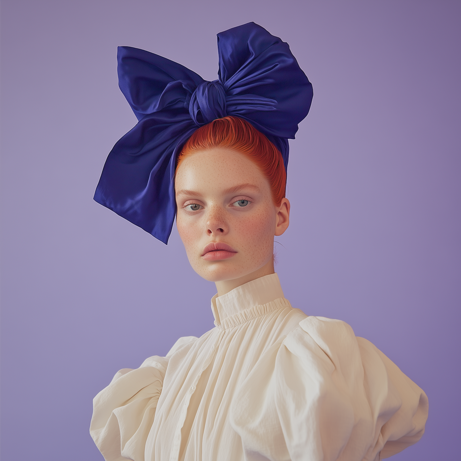 Elegant portrait of a woman with red hair and a large blue bow, wearing a white blouse against a lavender background.
