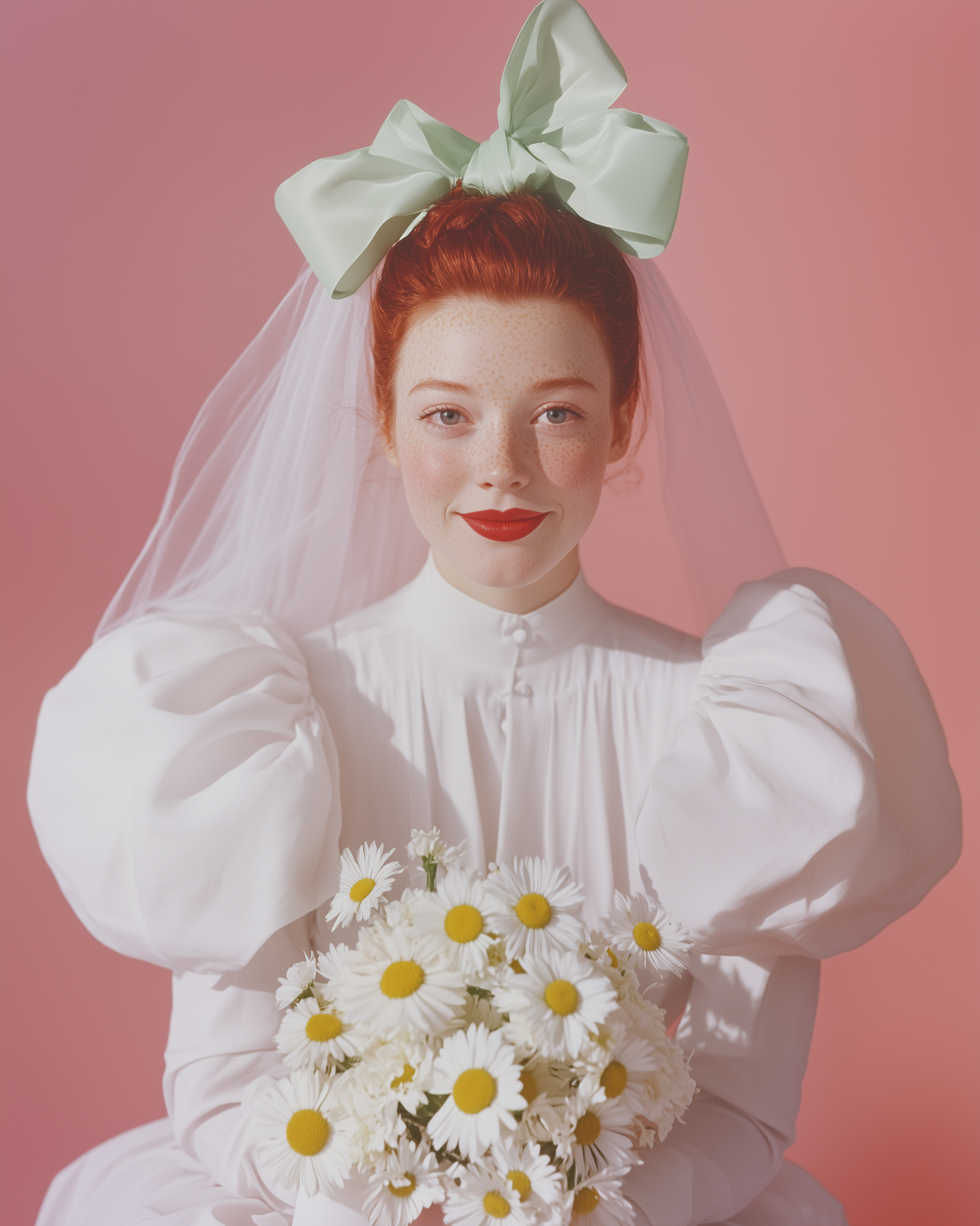 Young woman with red hair and mint bow, wearing a white dress, holding daisies against a pink background. Bright and cheerful scene.