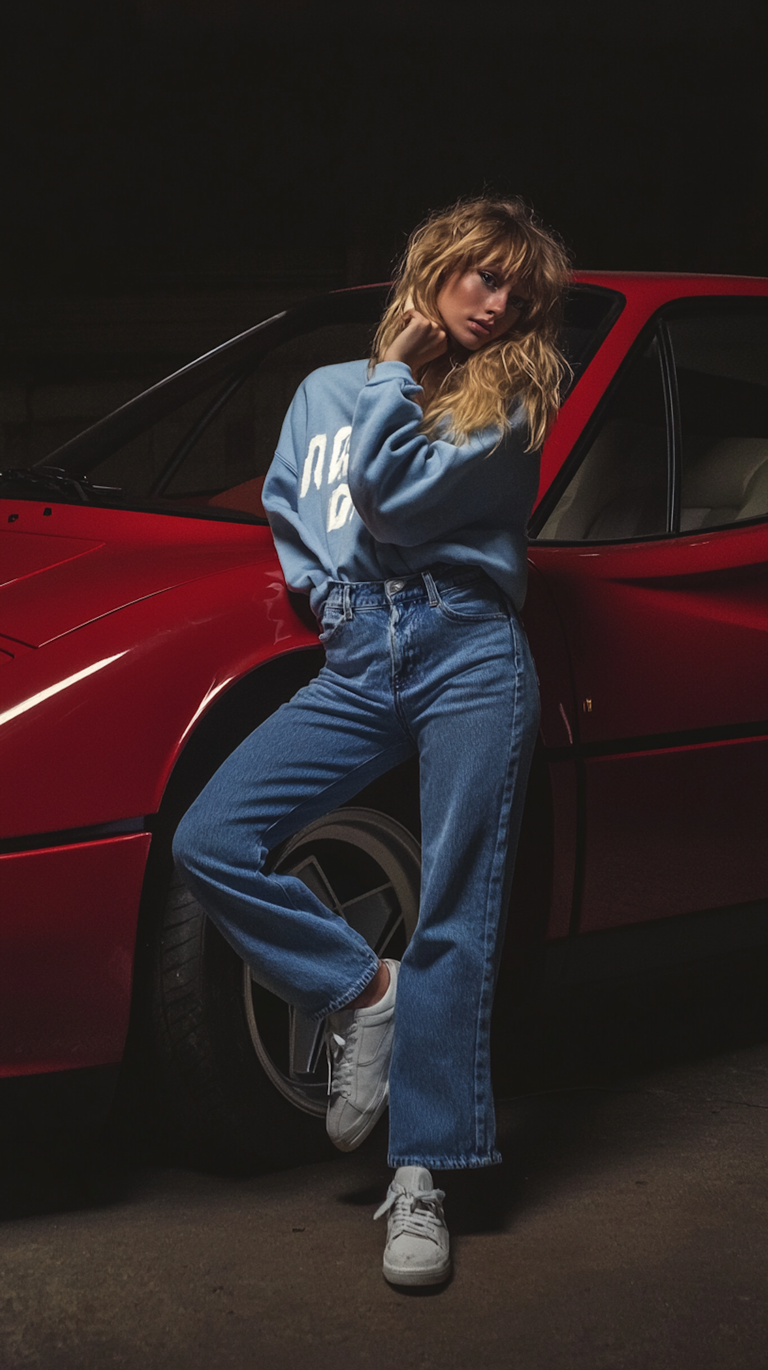 Stylish woman in blue sweatshirt and jeans poses by a red sports car in a dimly lit setting, exuding confidence and modern elegance.