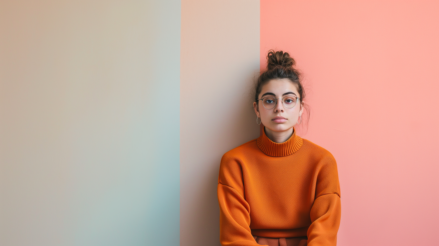 Young woman in orange sweater with glasses against a two-toned pastel wall, creating a vibrant and stylish contrast.