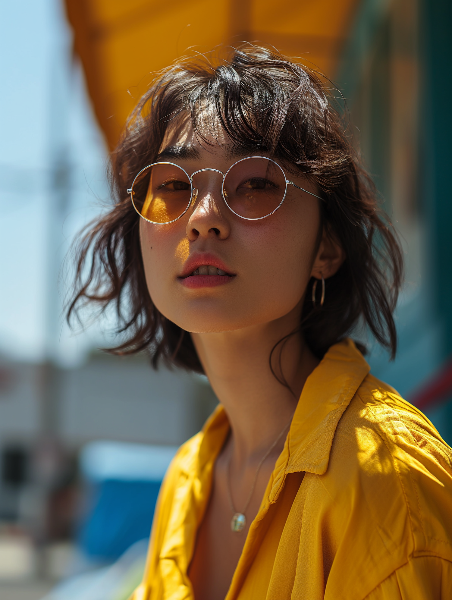 Stylish woman in yellow shirt and round sunglasses, gazing thoughtfully outdoors on a sunny day.