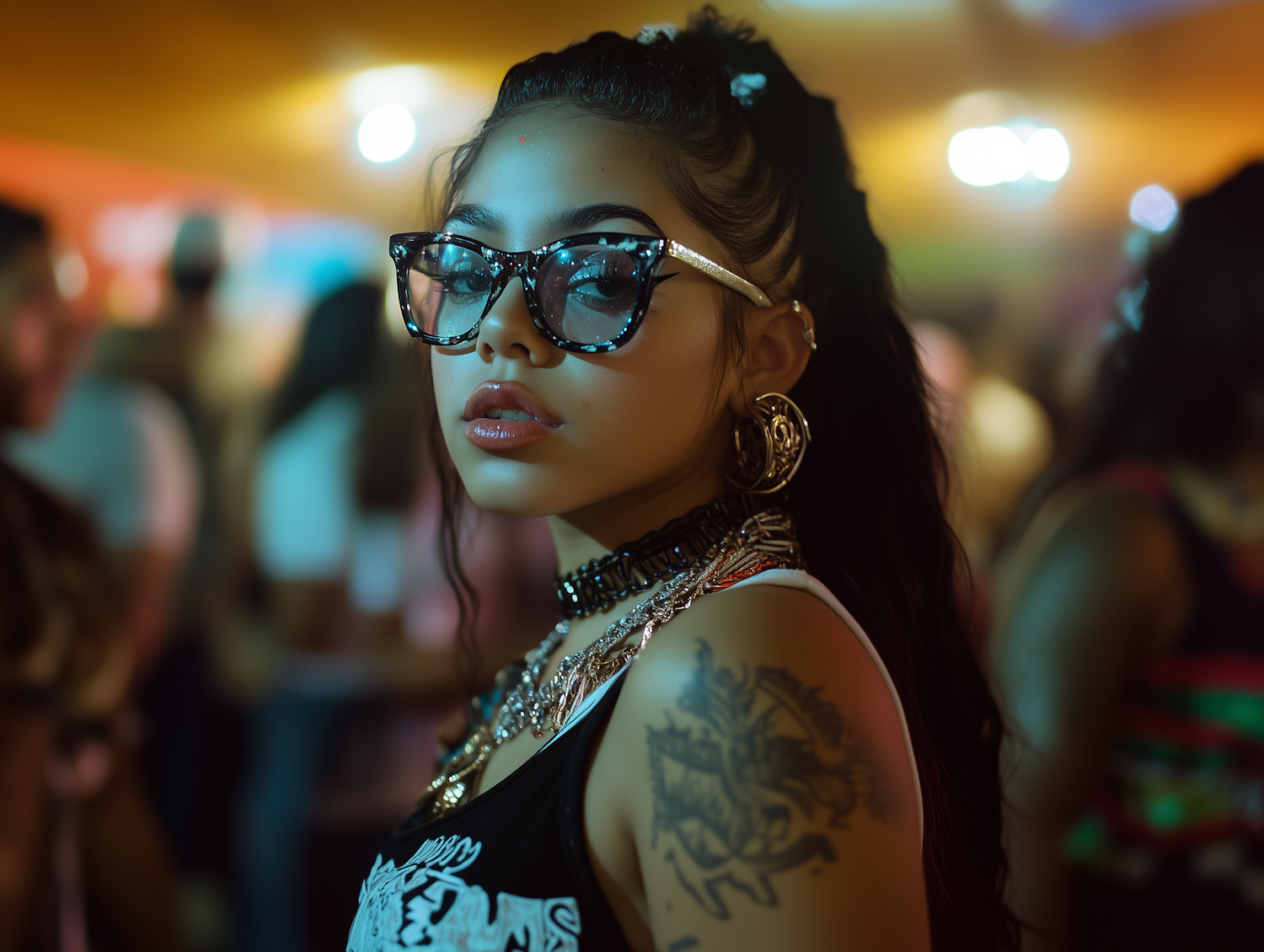 Stylish woman with glasses and tattoos in a vibrant, colorful setting, exuding confidence and edgy fashion.
