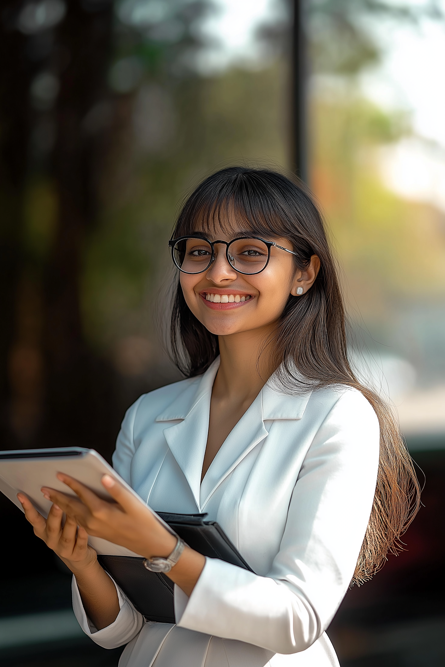 Young Asian woman in a white blazer holding a tablet, smiling confidently with glasses. Professional and approachable vibe.