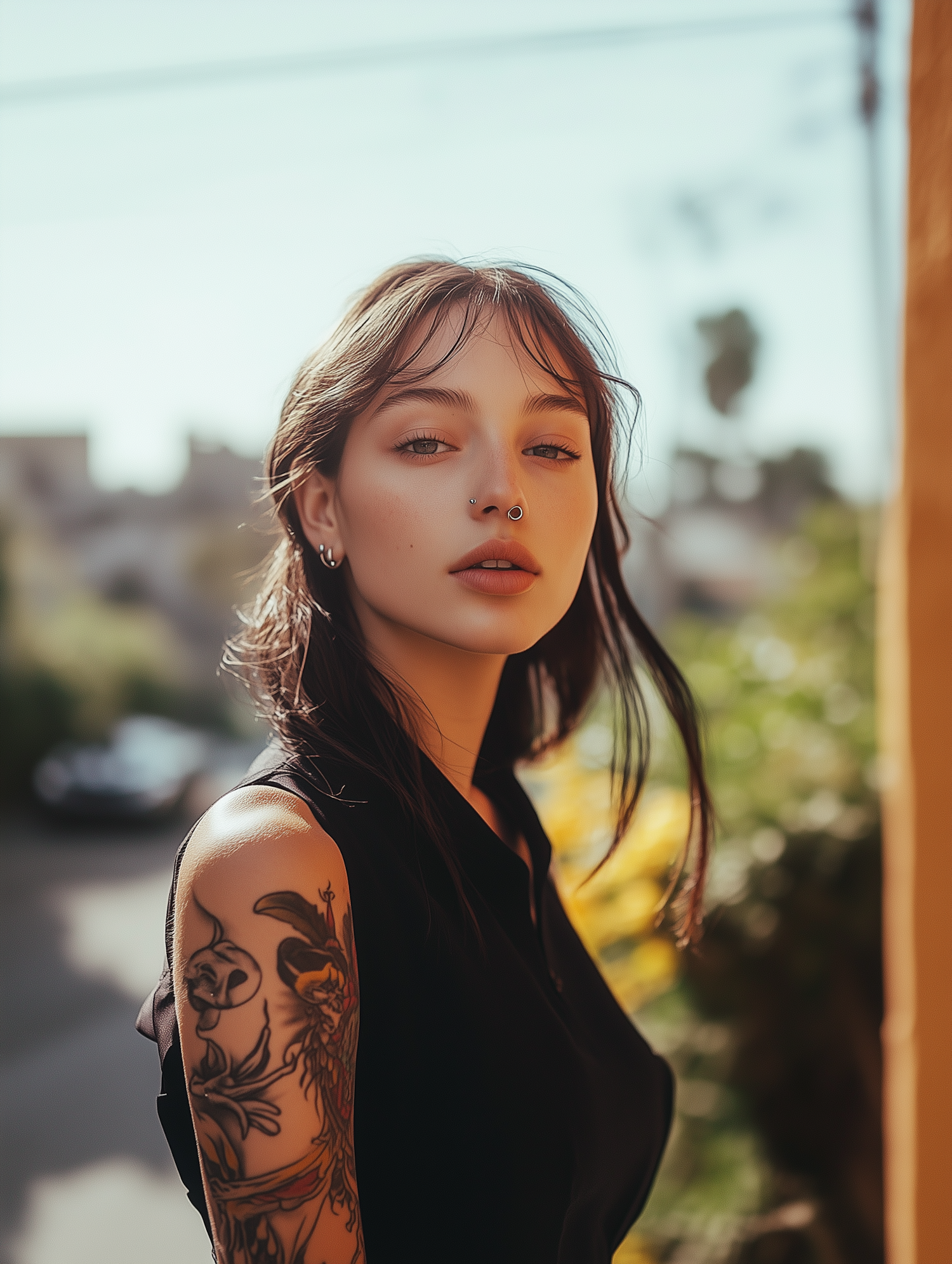 Young woman with dark hair and tattoos poses confidently outdoors in a sleeveless black top, exuding a modern and edgy style.