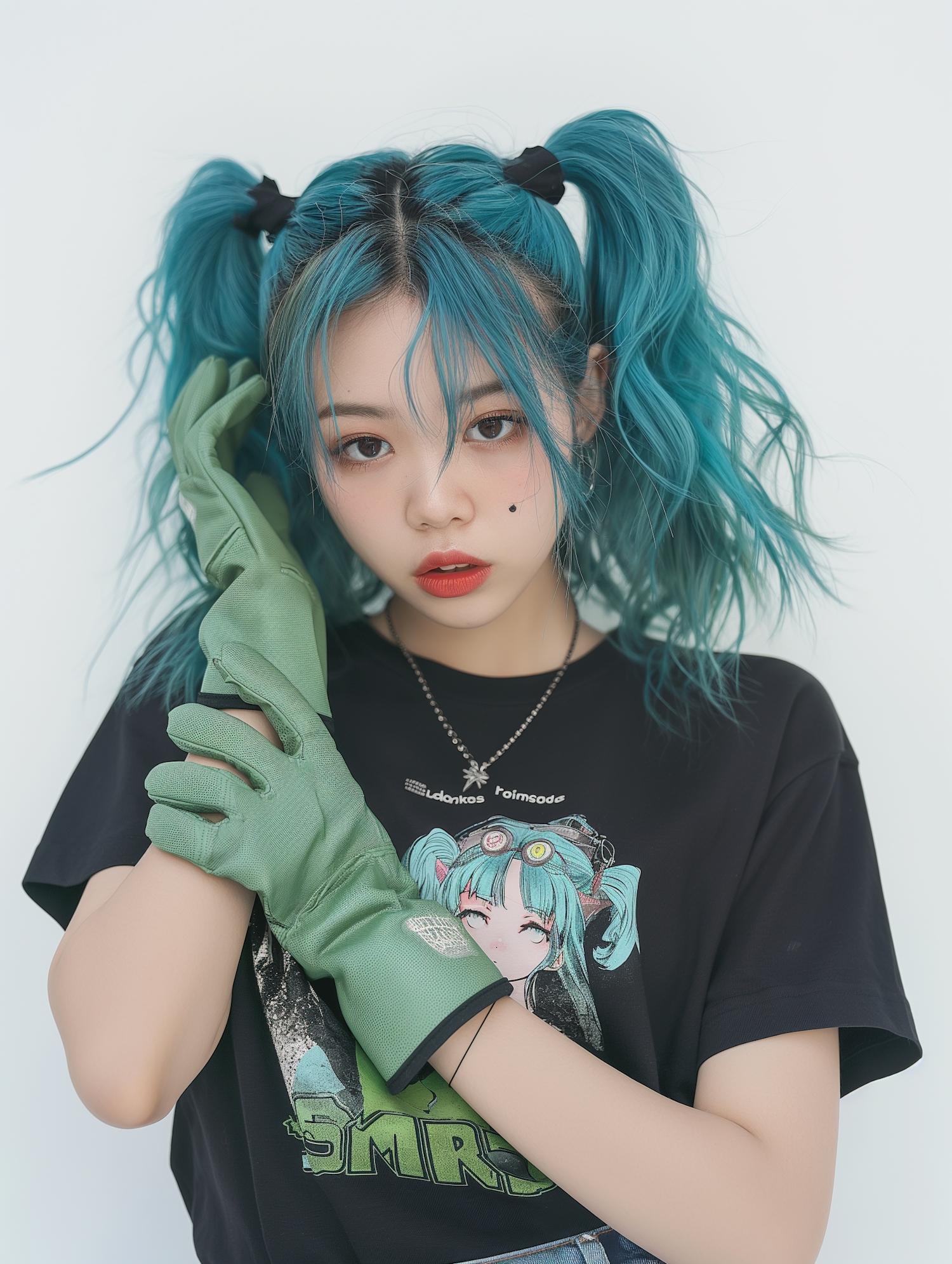 Asian woman with teal pigtails, red lips, and a black anime t-shirt, holding a green glove against a light background.