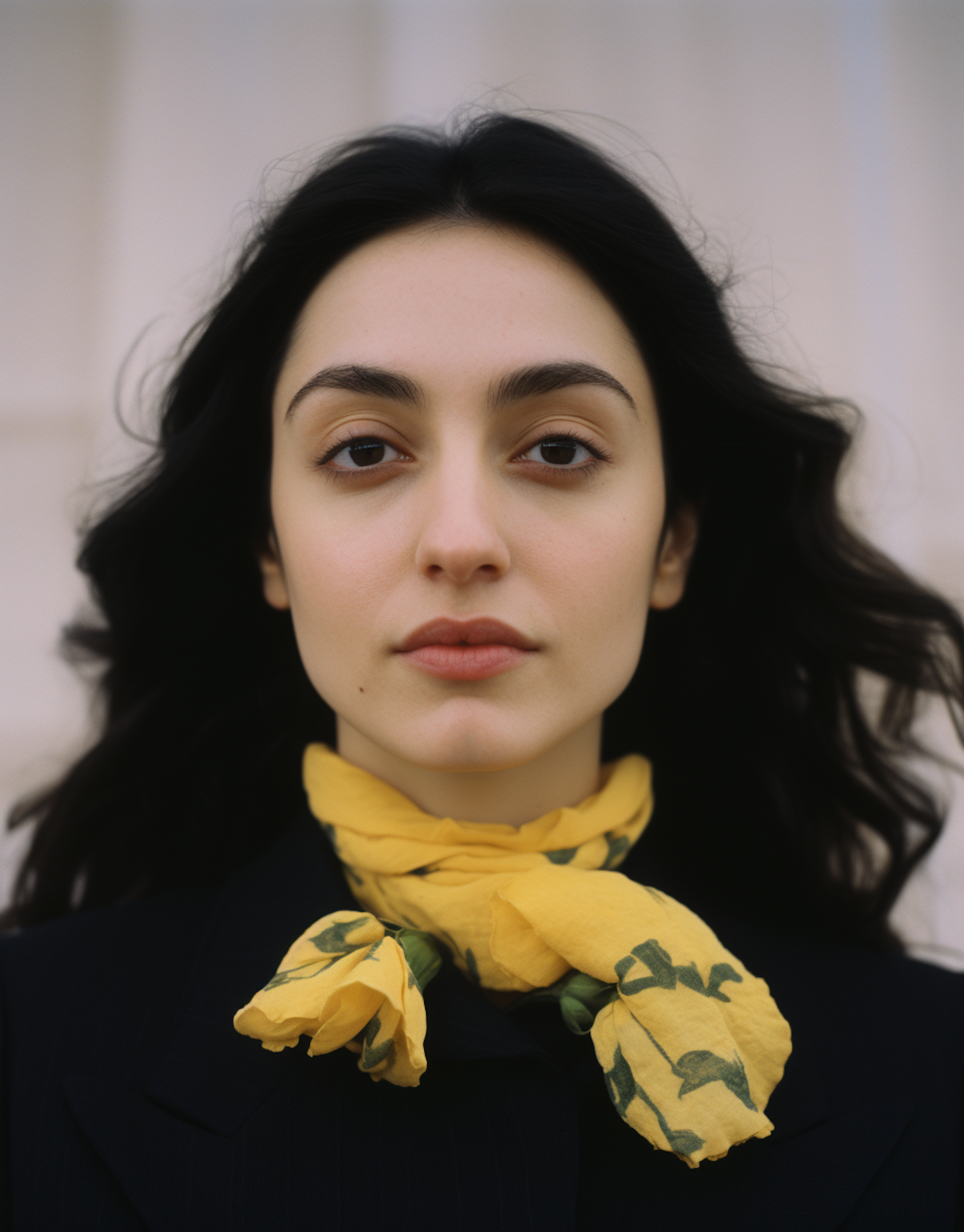 Portrait of a young woman with wavy black hair, wearing a yellow scarf with green patterns, exuding calm and confidence.