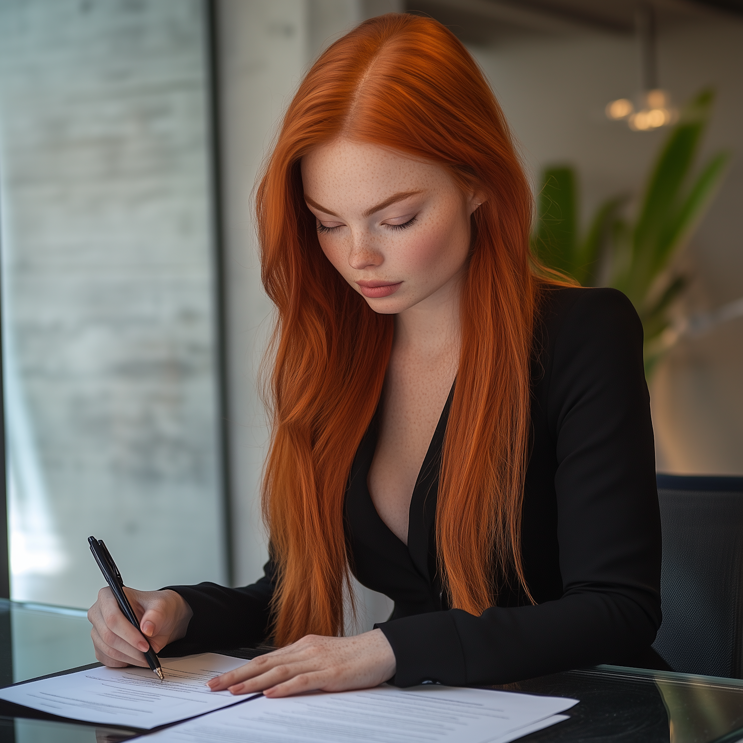 Young woman with red hair signing a document in a modern office setting, wearing a black blazer.