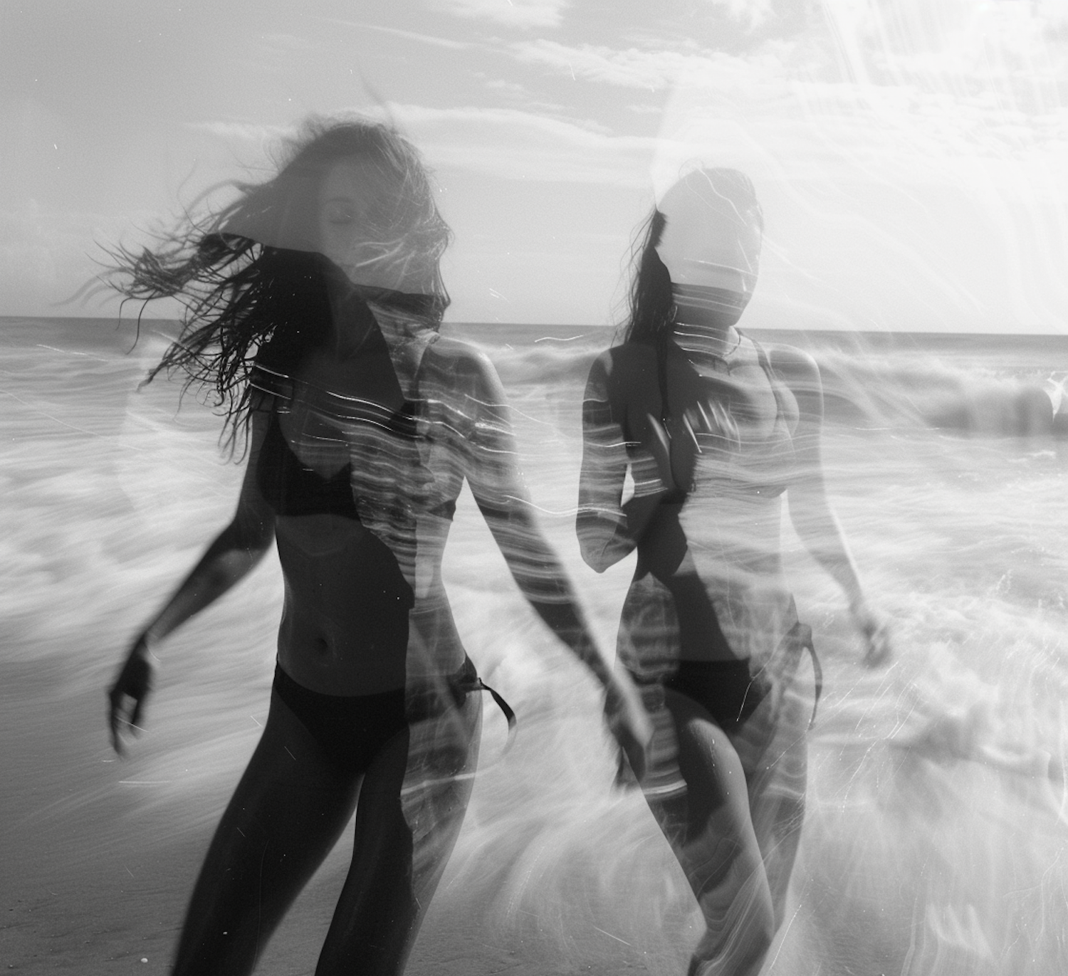 Artistic black and white photo of two women on a beach with motion blur and double exposure effects, creating a dreamlike scene.
