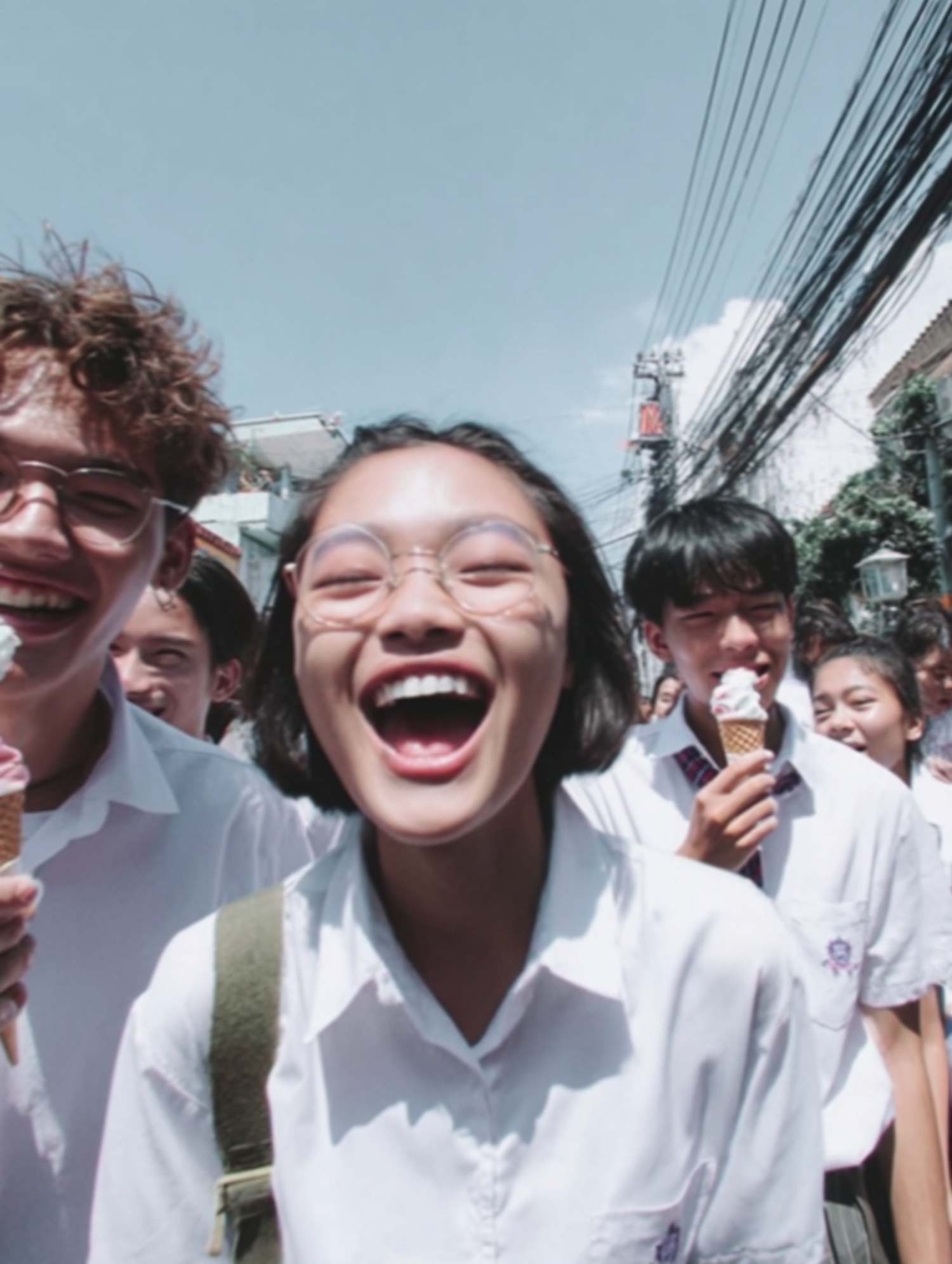 A group of students in white uniforms enjoying ice cream outdoors, with a joyful atmosphere and a sunny urban backdrop.