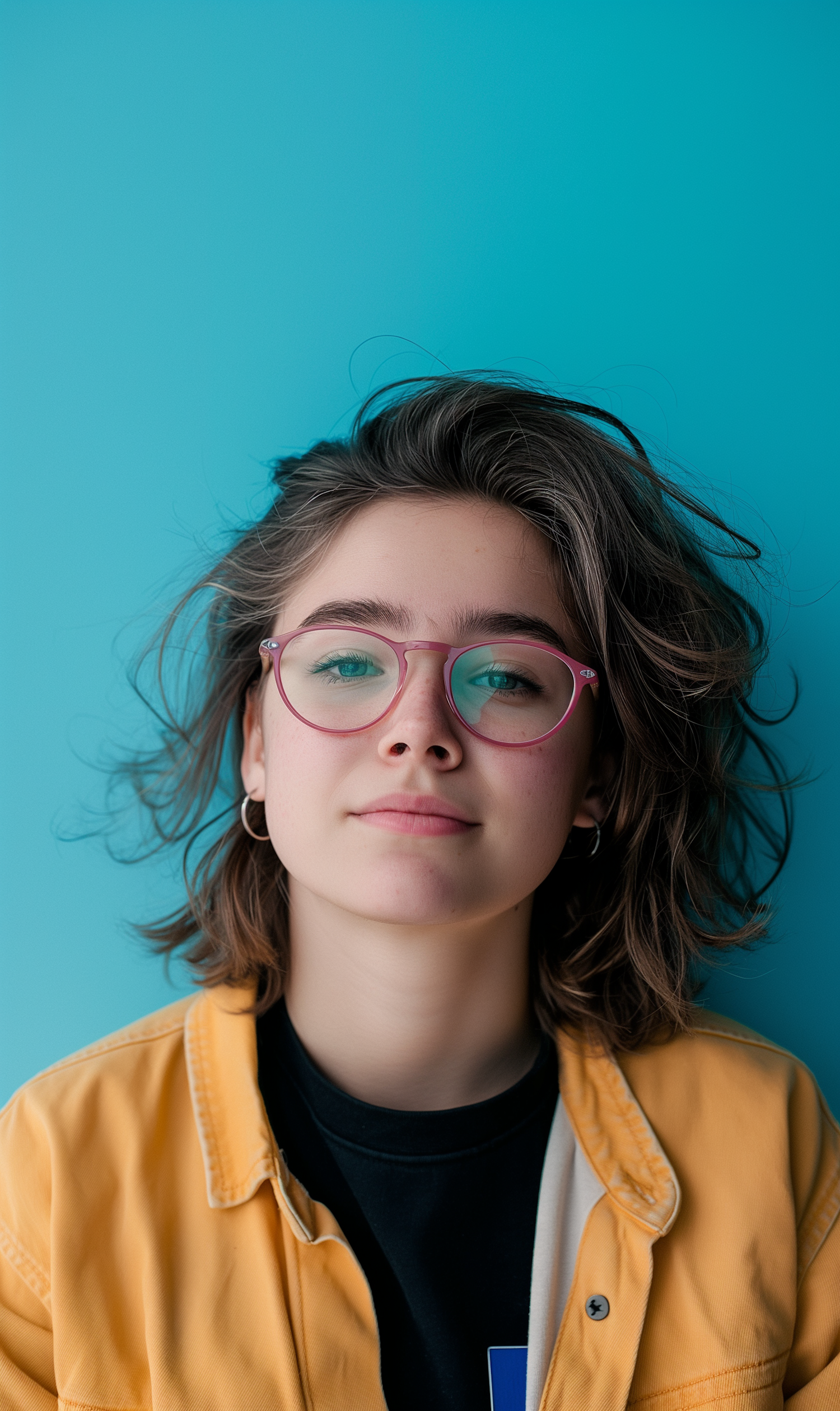 Confident young person with pink glasses and yellow jacket against a turquoise background, exuding a modern and stylish vibe.