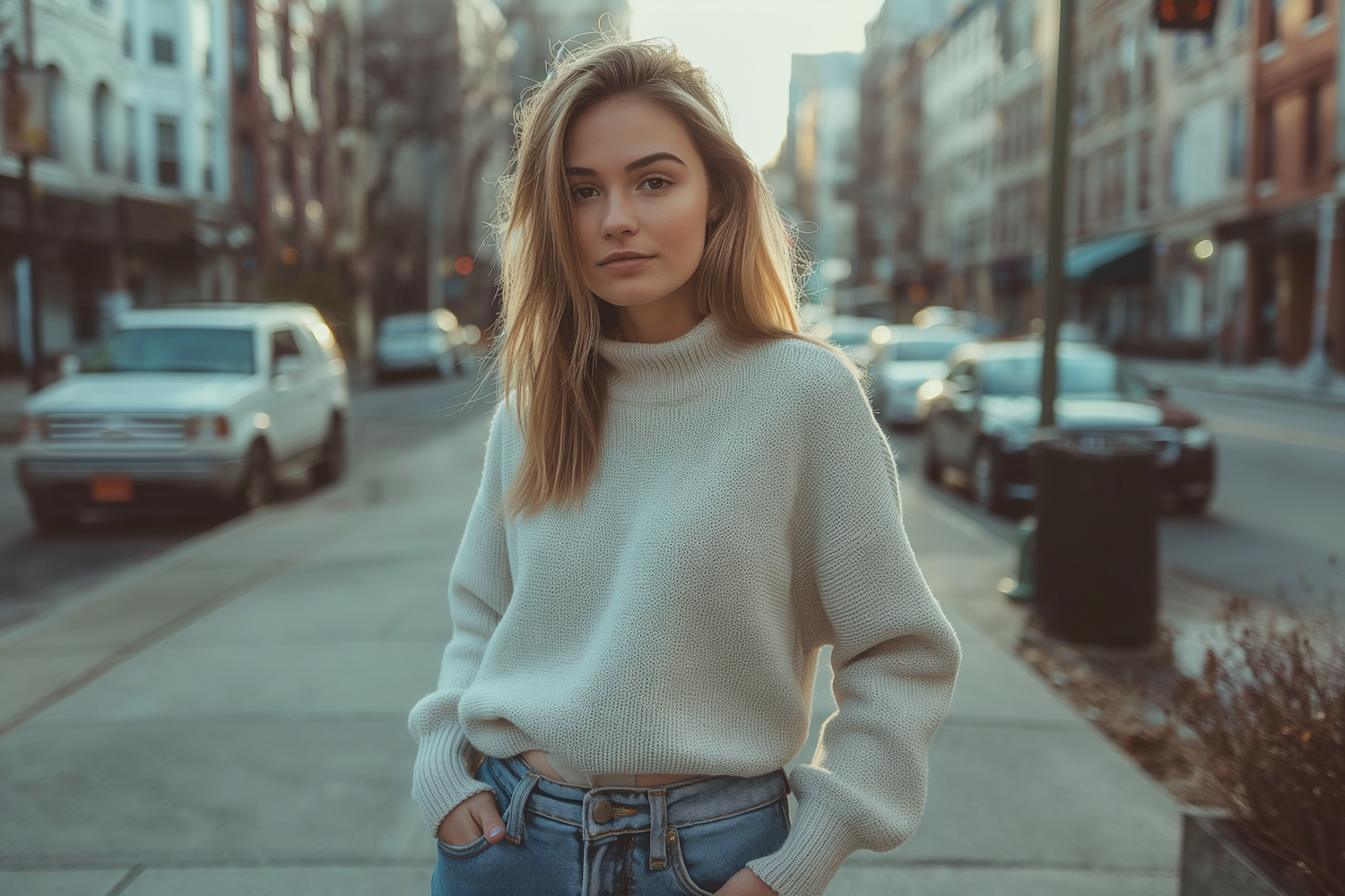 Young woman in a cozy sweater stands confidently on a city street, with a warm sunset glow and urban backdrop.