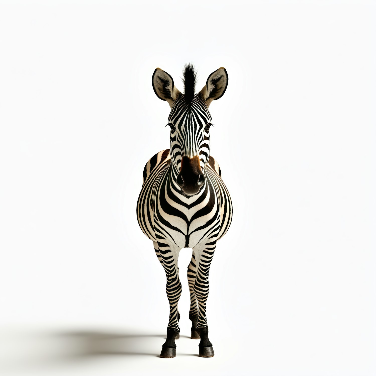 Striking zebra with bold black and white stripes stands against a white background, showcasing its unique pattern and symmetry.