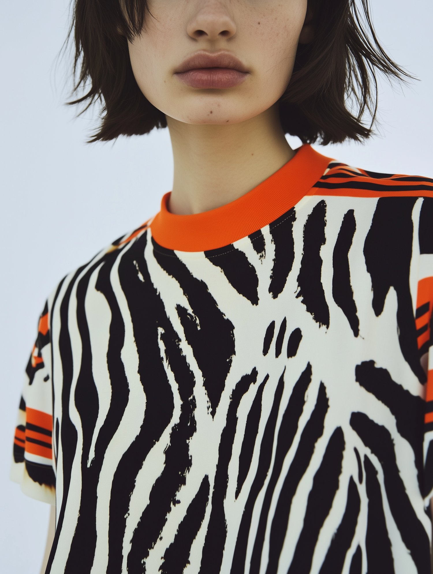 Close-up of a zebra-print shirt with orange accents, worn by a person with short dark hair and freckles, set against a light blue background.
