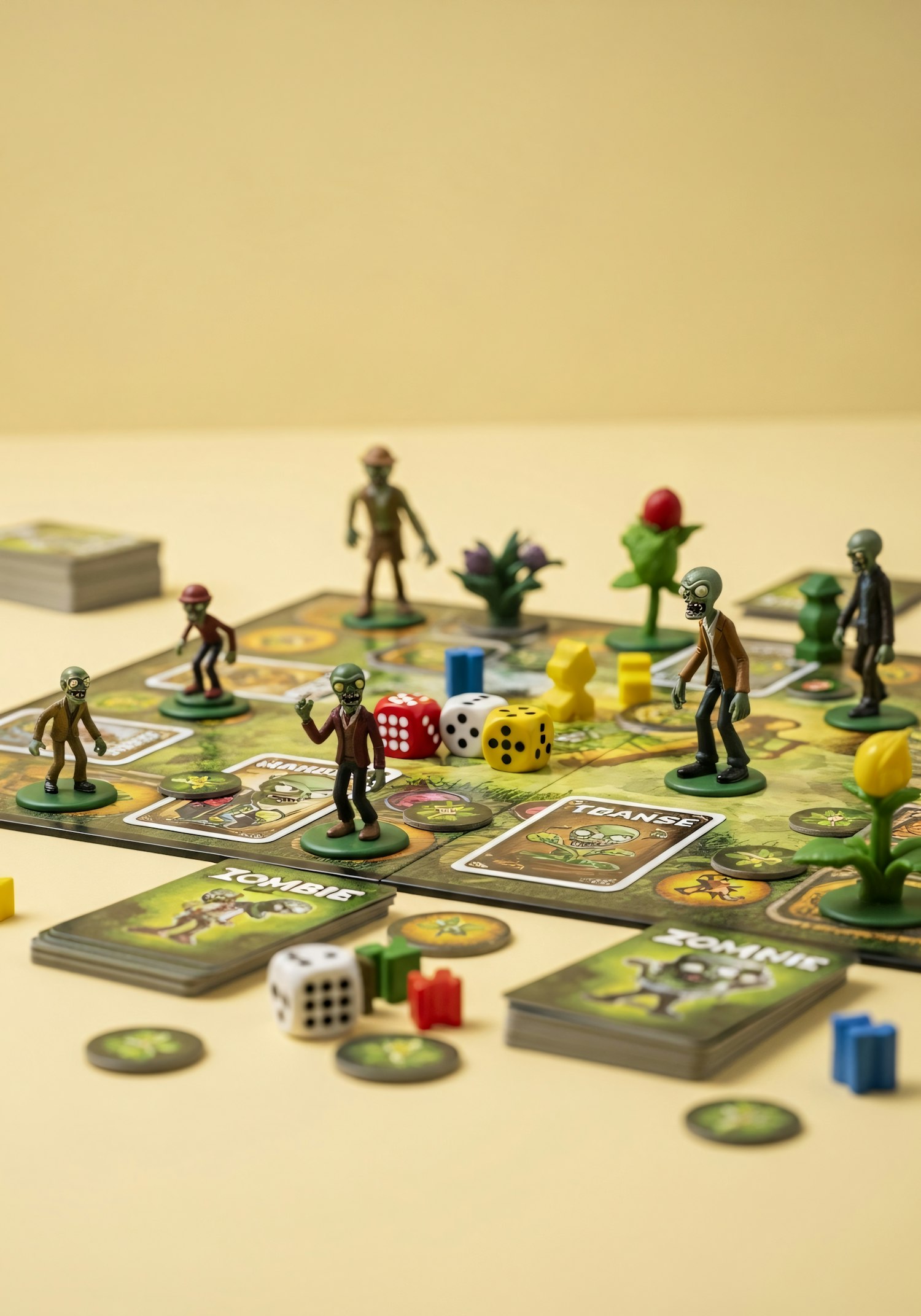 A vibrant tabletop board game setup with zombie figurines, colorful dice, and cards, set against a neutral background.