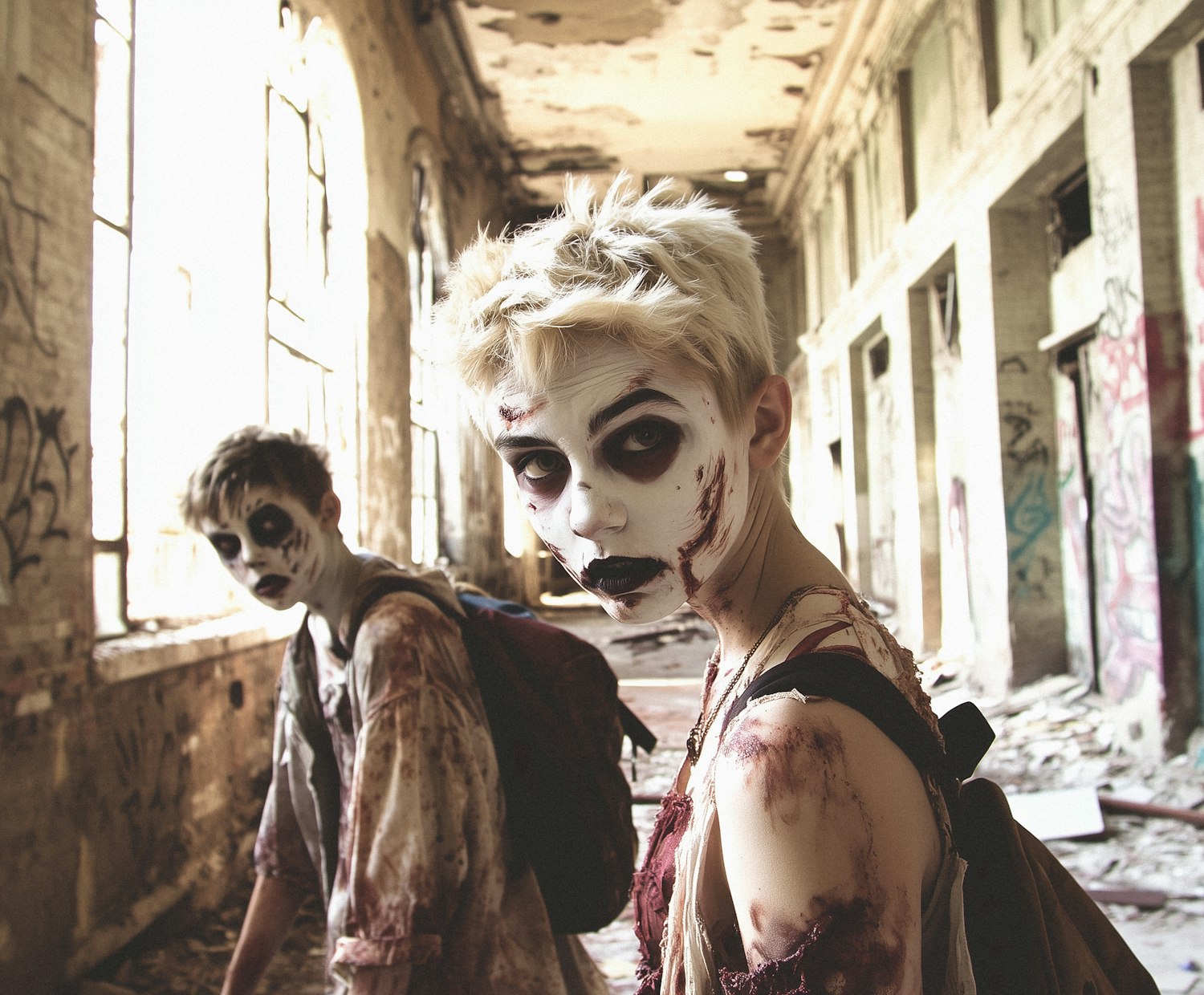 Two zombie-like individuals in a decaying, graffiti-filled building, with dramatic makeup and blood-stained clothing, creating a haunting scene.