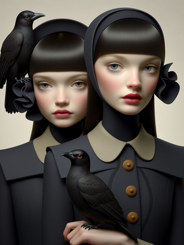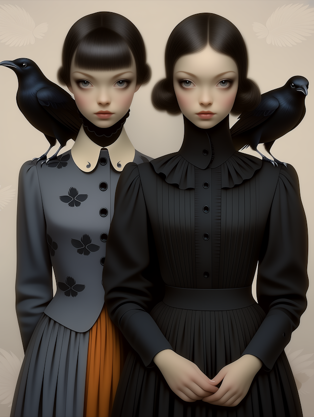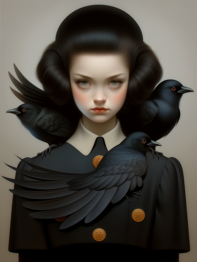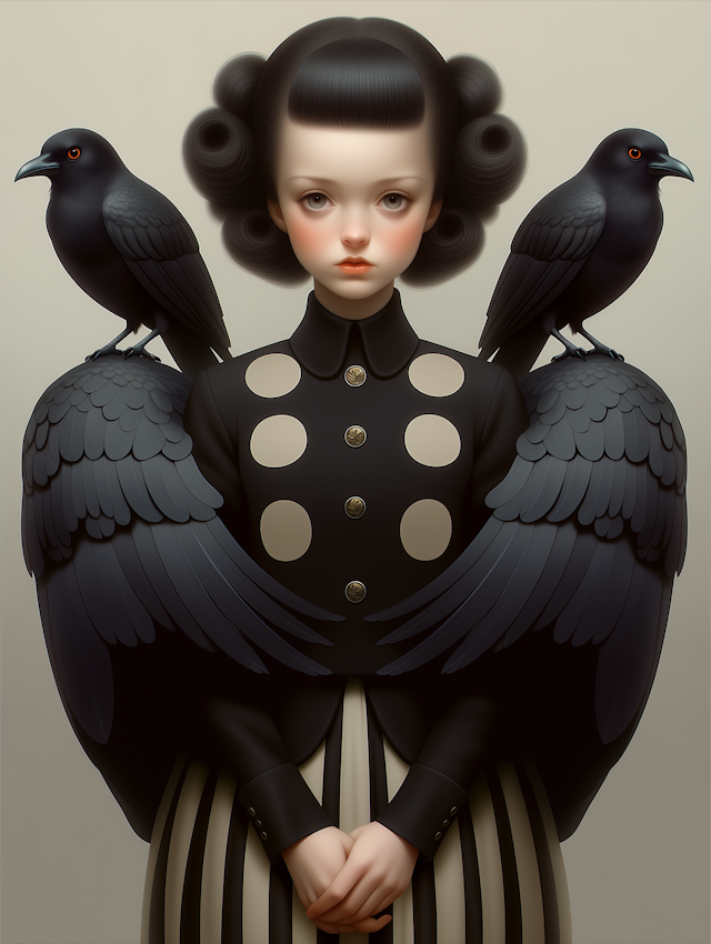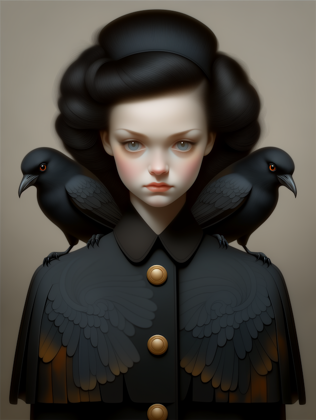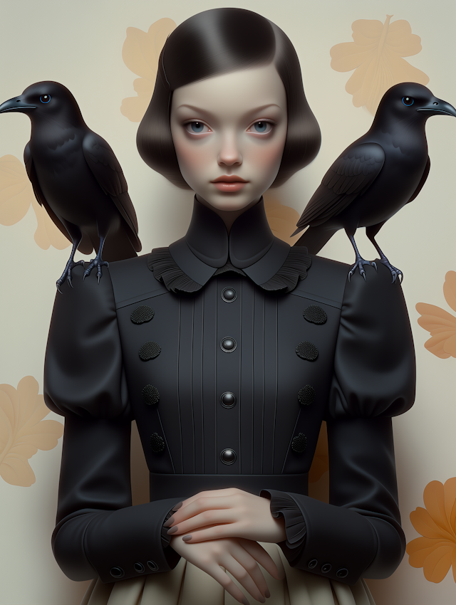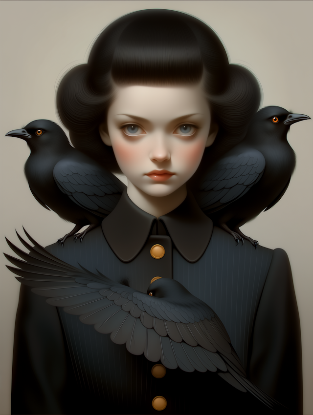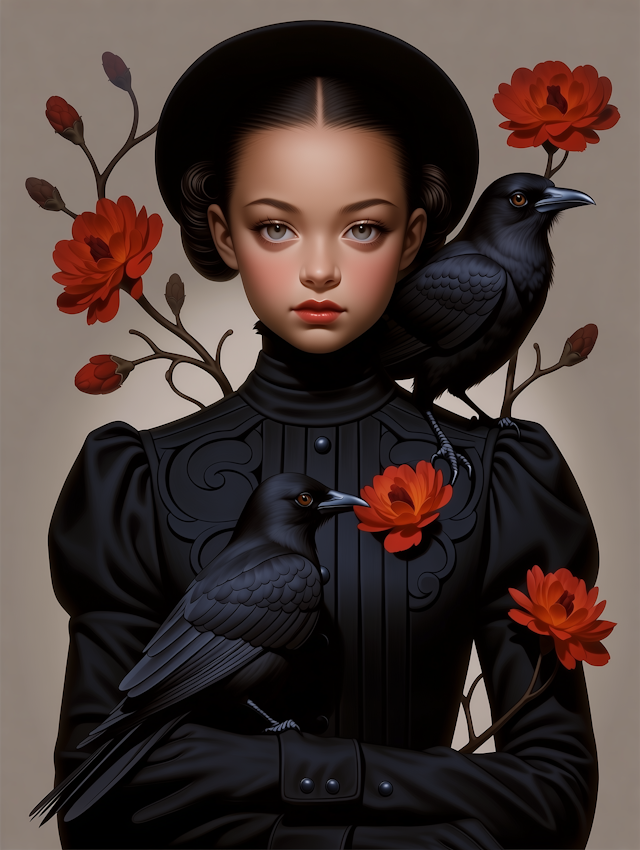- IllustrationElegant compositionVivid colorsSymbolismGeometric patternsBirdMinimal backgroundMoody toneVintage fashionWomenWide-brimmed hatSymbolic compositionRed flowersEnigmaticMelancholy expressionNeutral backgroundBlack birdsBlack and whitePerched birdSymmetryElegant attireGraphic artWoman with hatArtistic portraitYoung womanSoaringOrnateSurrealNatureMagpieStylizedDetailed clothing