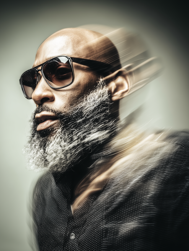 - PortraitSleek styleUrban styleSplit-tone effectModernGrayscaleArtistic portraitUrban settingCalm atmosphereDramatic lightingSereneMotion blurNeutral expressionTabletCreative spaceMonochromaticFashionLight gray sweaterSomberBlue eyesMinimalisticProfessionalBaldDark sunglassesIndoor settingModelBeardWhite beardGray outfit