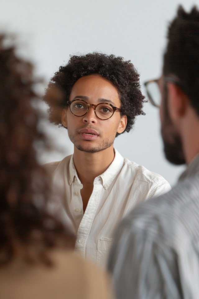 - Team discussionNatural lightingModern officeContemporary settingOffice environmentFocused interactionFormal attireTechnologyCurly hairDiscussionGroup discussionMinimalistic designOfficeSmilingConversationWomenPlanningMan and womanCollaborationCasualPlantsJoyful conversationInteractionNotebookCoworkingDesign studio