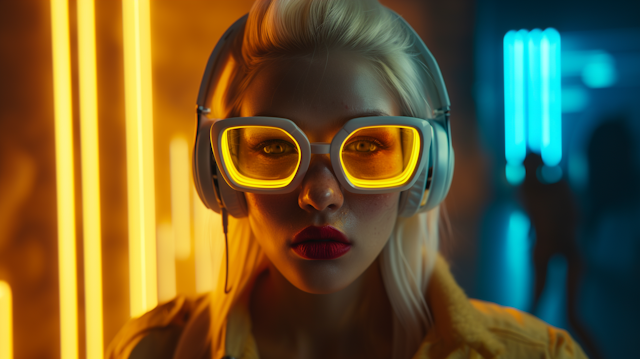 - FutureHigh-tech outfitGlitch effectColor contrastIlluminated glassesExtravagant fashionIridescent suitTechnologyRunway showHelmetSci-fiGlowing cubeUrban nightlifeHigh-tech clothingGlowingVibrantCool tonesIntelligenceArtificialIntense gazeExplorationMetallicLight streaksGlowing lightsCinematicGlowing visorGlamorousNeon lights