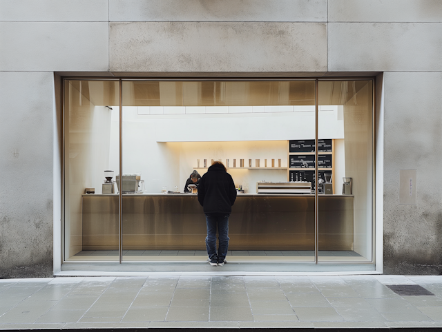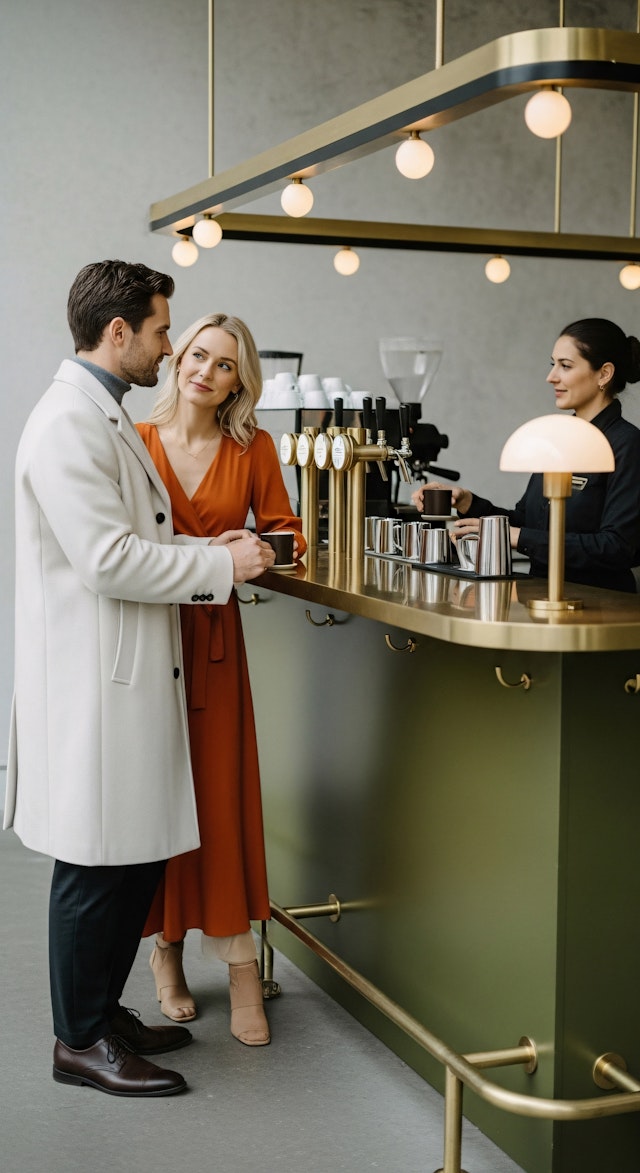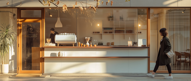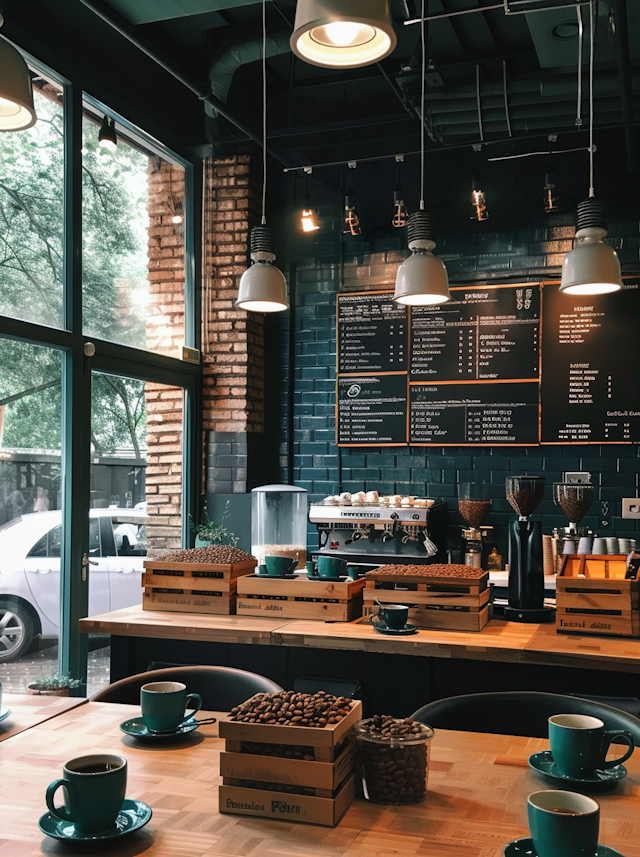 - ModernCustomer interactionCoffee shopAmbient lightingIndustrial vibeTranquilYellow accentsBrick wallGolden hourGlass facadeStorefrontCoffeeCasual clothingEmployees workingVibrant colorsOlive treePotted plantsVintageConversationCozyEspresso machineCoffee barCafe-interiorInterior designBaristaGreen decorArtwork