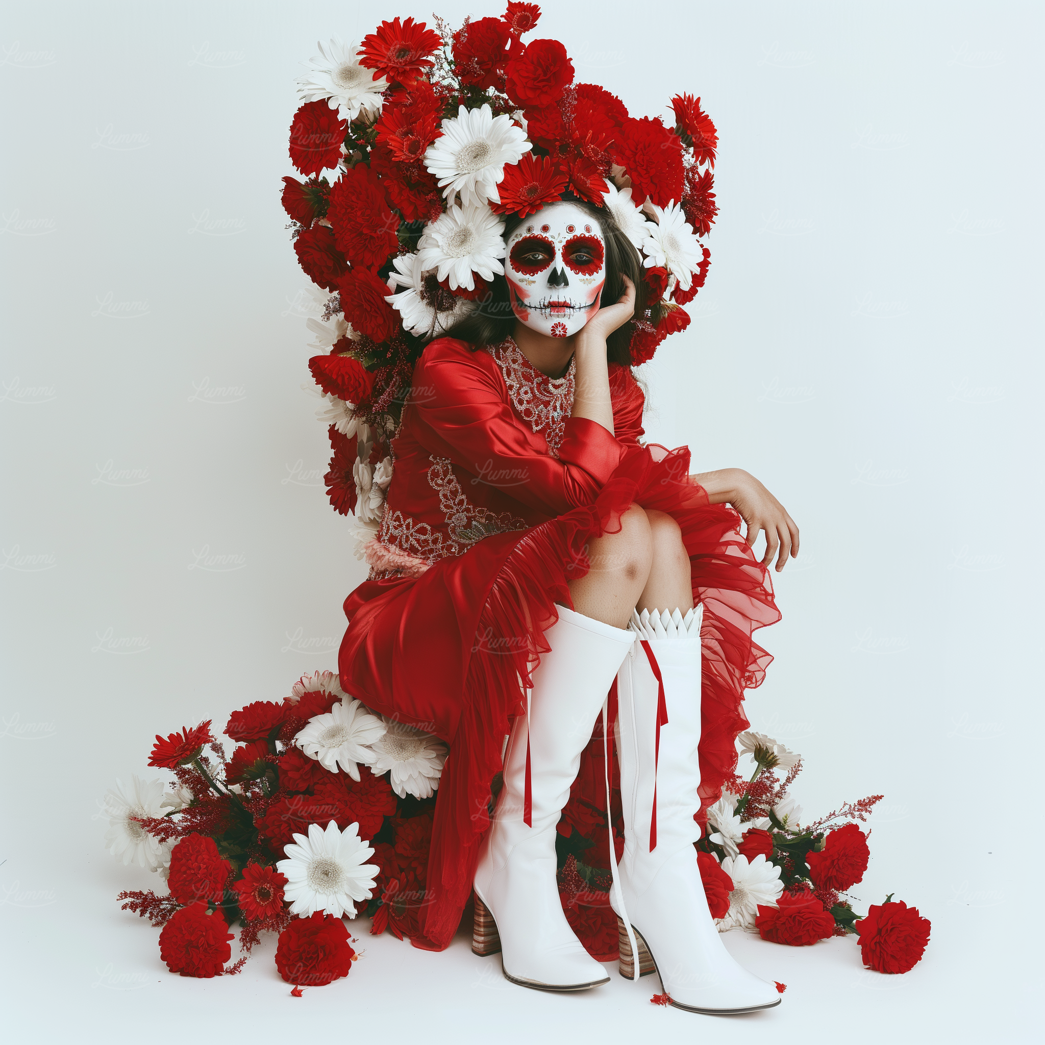 - Traditional-outfitDia de los MuertosDadcorePrayerLa CatrinaMexicanRed dressReligiousCultural expressionCross pendantSereneReligious artefactsFloral-wreathGold-embroideryArchitectureSkull face paintWarm lightingStone carvingRemembranceUrbanSkull makeupSunlightTwilightGarden sceneDay of the DeadCulturalFestivalColorfulStatueSolemn