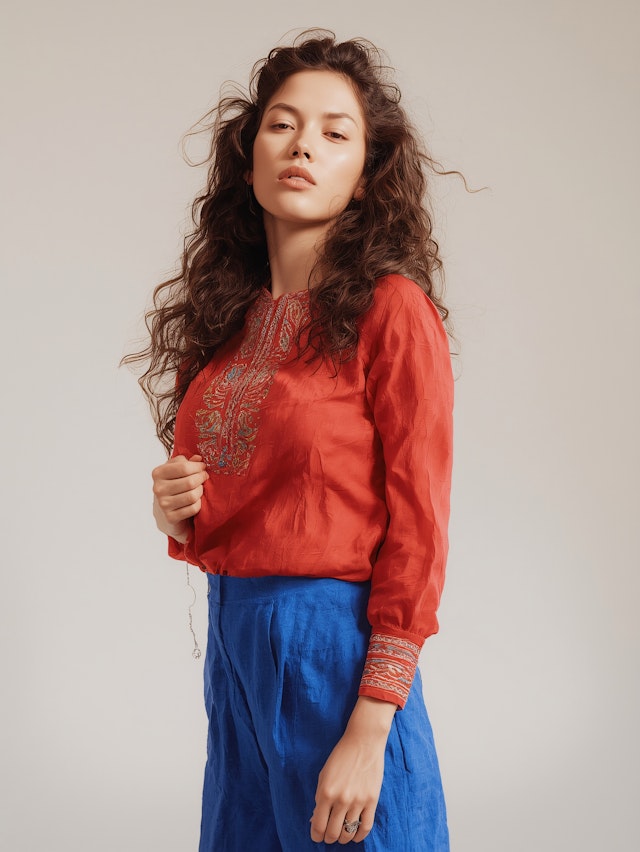 - EmbroideryModern lookCream-shirtPeach blouseCorporateHigh endLook bookGradientEditorialOrnamental patternsNeutral tonesBold lipstickSoft colorsBlazerNatural lightModelSophisticatedEleganceEthnicStylePolka dot blouseSoft makeupDark blue trousersPortraitTrendFashionBurgundy shirtSmilingSilky textureNeutral backgroundTraditional clothing