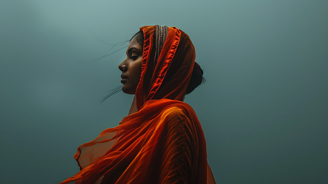 - IntrospectiveContemporary styleCulturalEthnicTeal dressSereneStyleVibrantPastel backgroundWinter sweaterFashionNeutral backgroundFlowersLace maskSuede bagStylishColor blockHijabWomanExpressive eyesSophisticationYellow blouseVivid colorsPearl earringTranquilityConfidenceGreen attireSerene expressionColor contrastTeal blazer