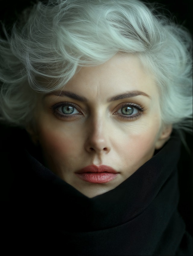 - Professional attirePurple sweaterNeutral expressionHairstyleClose upSereneMuted colorsFormal attireGlossy hairRed lipstickMotion blurSilver grey hairNatural shineWavy hairFur coatSubtle makeupTimeless beautyAbstractEditorialEtherealOlder womanMature womanConfidenceModern aestheticIntense expressionContrastMysteryAsian womanPortraitPlatinum blondeFashion