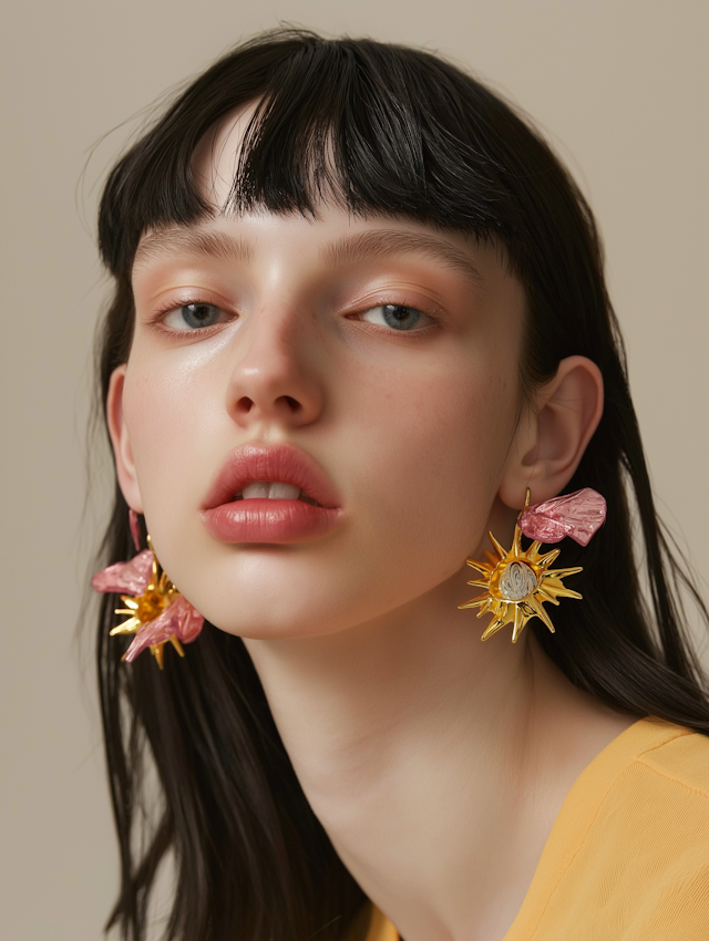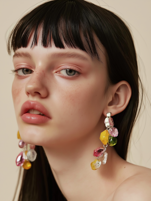 This Shoot features women showcasing vibrant, crystal and stone earrings against a soft beige backdrop. With natural skin textures and subtle makeup, the focus stays on the stunning jewelry and the effortless beauty of each model.